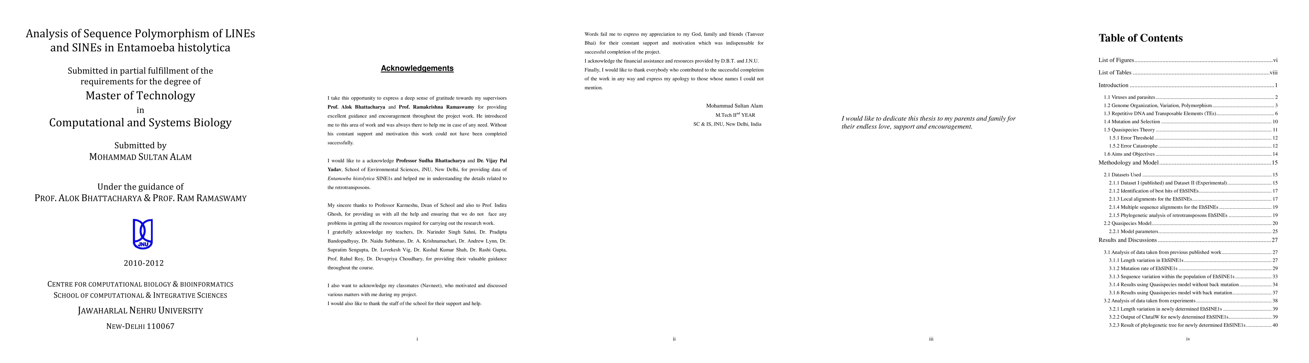 The goal of this dissertation is to study the sequence polymorphism in retrotransposable elements of Entamoeba histolytica. The Quasispecies theory, a concept of equilibrium (stationary), has been used to understand the behaviour of these elements. Two datasets of retrotransposons of Entamoeba histolytica have been used. We present results from both datasets of retrotransposons (SINE1s) of E. histolytica. We have calculated the mutation rate of EhSINE1s for both datasets and drawn a phylogenetic tree for newly determined EhSINE1s (dataset II). We have also discussed the variation in lengths of EhSINE1s for both datasets. Using the quasispecies model, we have shown how sequences of SINE1s vary within the population. The outputs of the quasispecies model are discussed in the presence and the absence of back mutation by taking different values of fitness. From our study of Non-long terminal repeat retrotransposons (LINEs and their non-autonomous partner's SINEs) of Entamoeba histolytica, we can conclude that an active EhSINE can generate very similar copies of itself by retrotransposition. Due to this reason, it increases mutations which give the result of sequence polymorphism. We have concluded that the mutation rate of SINE is very high. This high mutation rate provides an idea for the existence of SINEs, which may affect the genetic analysis of EhSINE1 ancestries, and calculation of phylogenetic distances.