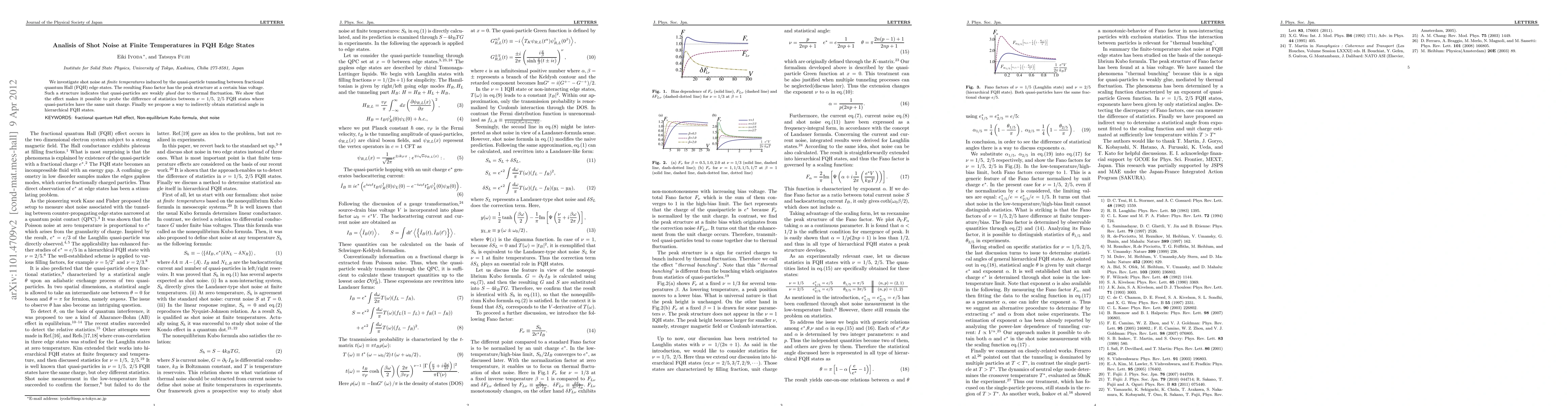 This paper analyzes shot noise at finite temperatures in fractional quantum Hall edge states, revealing a peak structure in the Fano factor due to quasi-particle tunneling. The study demonstrates that this thermal fluctuation effect can distinguish between the statistics of $\nu=1/5$ and $\nu=2/5$ states, despite their identical charge, and proposes a method to indirectly determine the statistical angle in hierarchical FQH states.