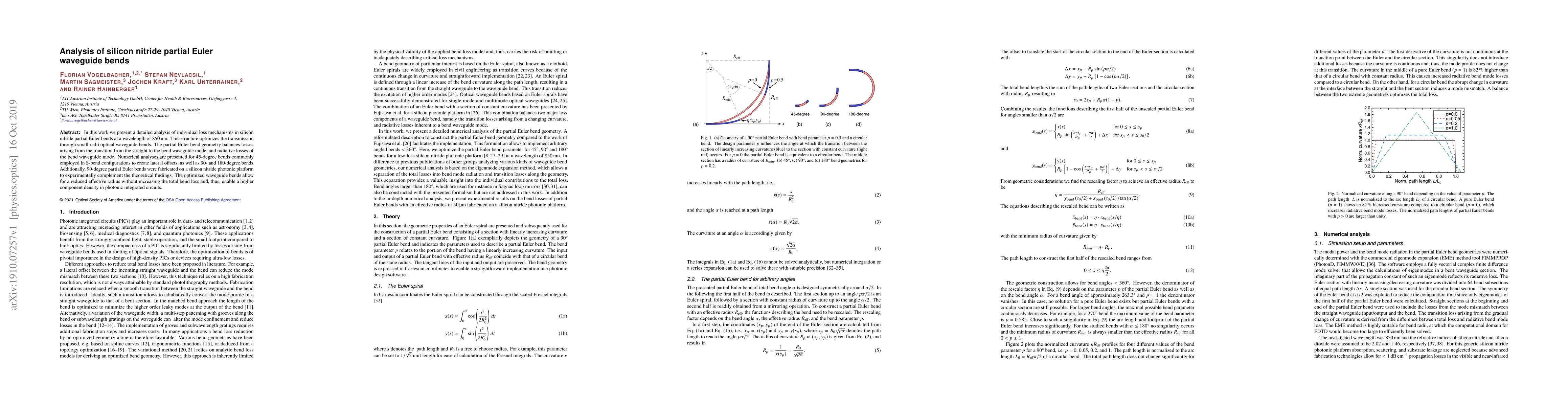 This paper analyzes loss mechanisms in silicon nitride partial Euler waveguide bends, optimizing transmission through small radii bends at 850 nm. Both numerical and experimental results show that the optimized geometry reduces bend loss, enabling higher component density in photonic circuits.