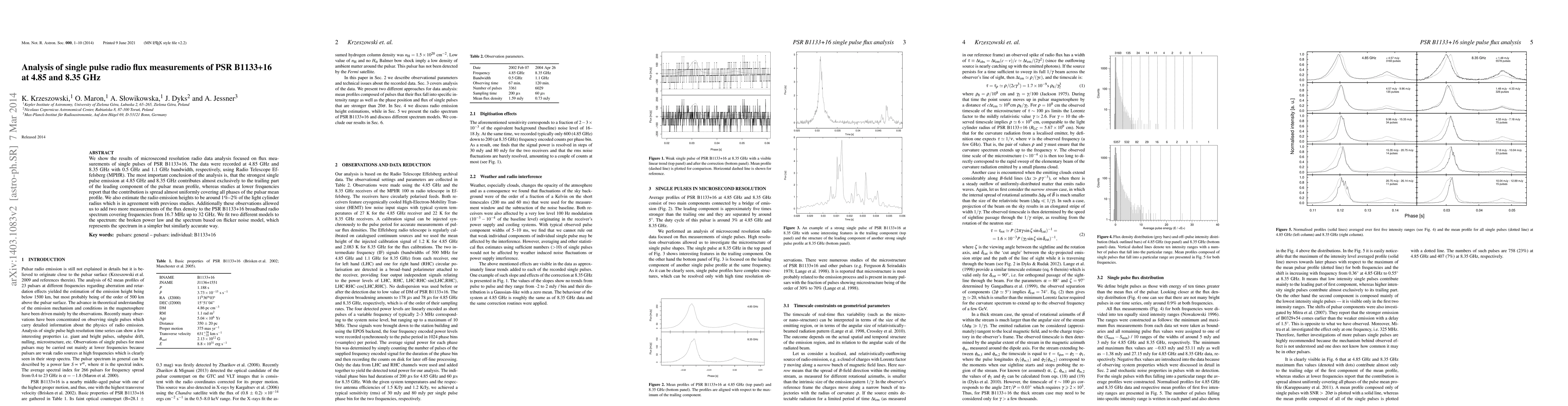 This study analyzes high-resolution radio data from PSR B1133+16 at 4.85 GHz and 8.35 GHz, revealing that the strongest single pulse emissions predominantly contribute to the trailing part of the pulsar’s leading component, contrasting with lower frequency observations. The research also estimates emission heights and fits two models to the broadband spectrum.