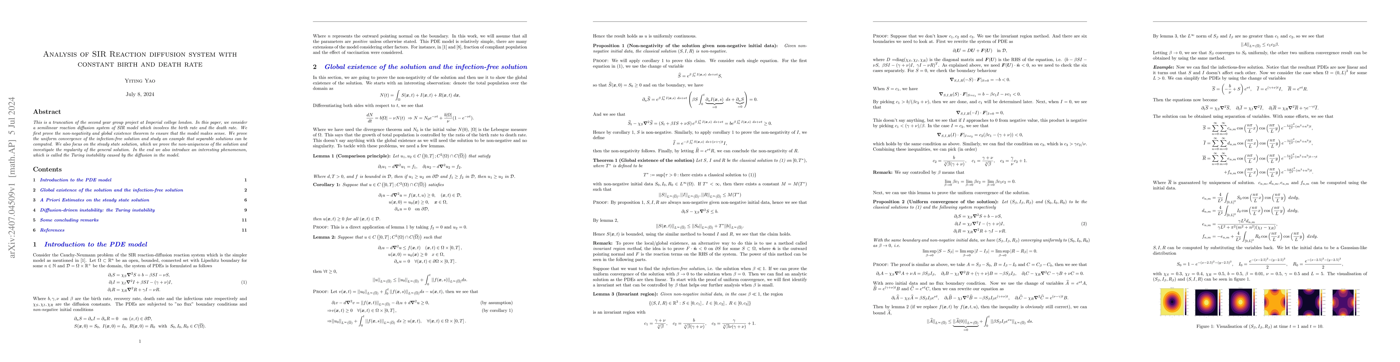 This is a truncation of the second year group project at Imperial college london. In this paper, we consider a semilinear reaction diffusion system of SIR model which involves the birth rate and the death rate. We first prove the non-negativity and global existence theorem to ensure that the model makes sense. We prove the uniform convergence of the infection-free solution and study an example that separable solutions can be computed. We also focus on the steady state solution, which we prove the non-uniqueness of the solution and investigate the regularity of the general solution. In the end we also introduce an interesting phenomenon, which is called the Turing instability caused by the diffusion in the model.