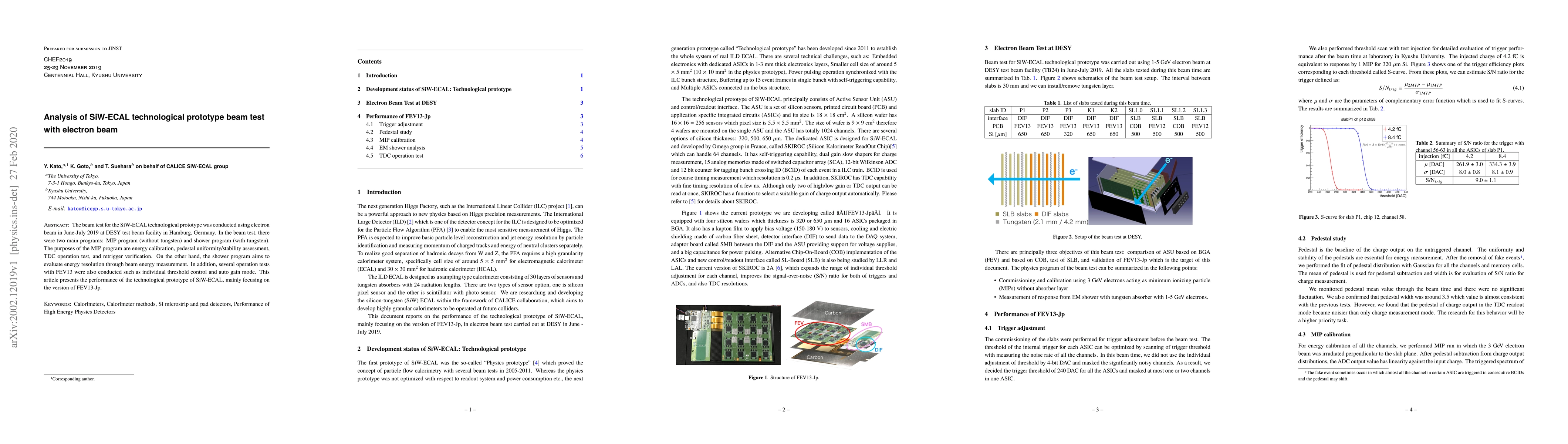 This paper reports on a beam test conducted in 2019 for a SiW-ECAL prototype, using an electron beam to evaluate energy calibration, MIP program performance, and shower program results, with a focus on FEV13-Jp version's operational tests. The test aimed to assess energy resolution and overall prototype performance.