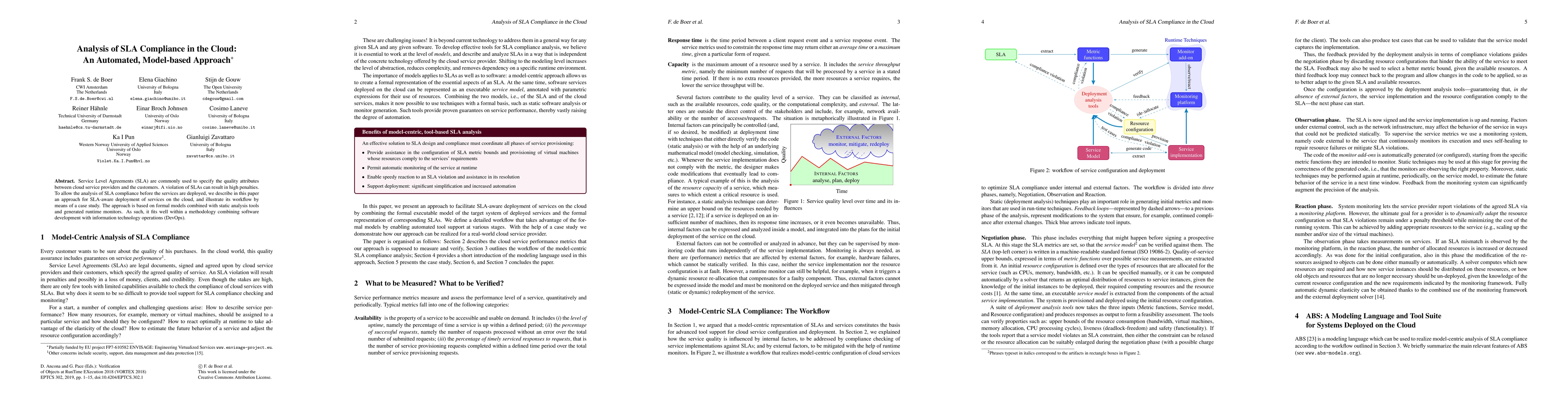 This paper proposes an automated, model-based approach for analyzing SLA compliance in cloud services before deployment. It combines formal models, static analysis tools, and runtime monitors to ensure adherence to Service Level Agreements, thus minimizing penalties and fitting within a DevOps methodology.