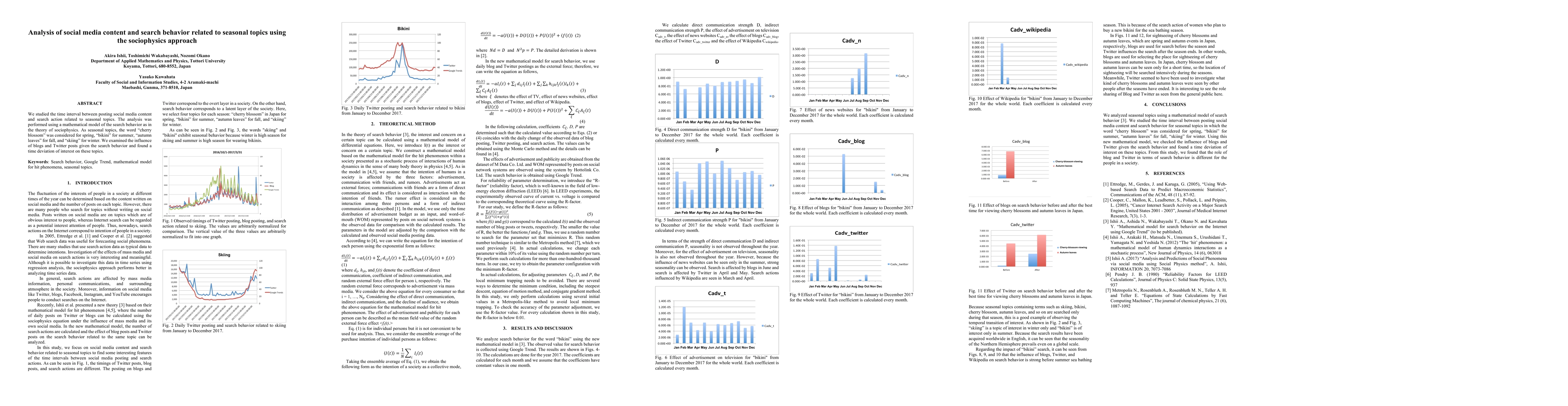 We studied the time interval between posting social media content and search action related to seasonal topics. The analysis was performed using a mathematical model of the search behavior as in the theory of sociophysics. As seasonal topics, the word cherry blossom was considered for spring, bikini for summer, autumn leaves for fall, and skiing for winter. We examined the influence of blogs and Twitter posts given the search behavior and found a time deviation of interest on these topics.