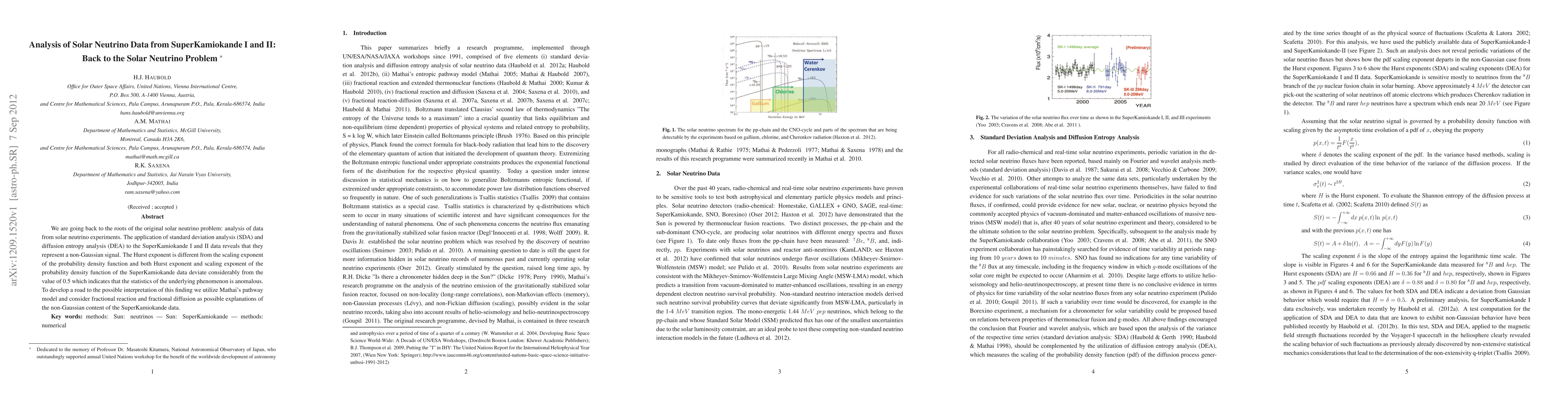 We are going back to the roots of the original solar neutrino problem: analysis of data from solar neutrino experiments. The application of standard deviation analysis (SDA) and diffusion entropy analysis (DEA) to the SuperKamiokande I and II data reveals that they represent a non-Gaussian signal. The Hurst exponent is different from the scaling exponent of the probability density function and both Hurst exponent and scaling exponent of the probability density function of the SuperKamiokande data deviate considerably from the value of 0.5 which indicates that the statistics of the underlying phenomenon is anomalous. To develop a road to the possible interpretation of this finding we utilize Mathai's pathway model and consider fractional reaction and fractional diffusion as possible explanations of the non-Gaussian content of the SuperKamiokande data.