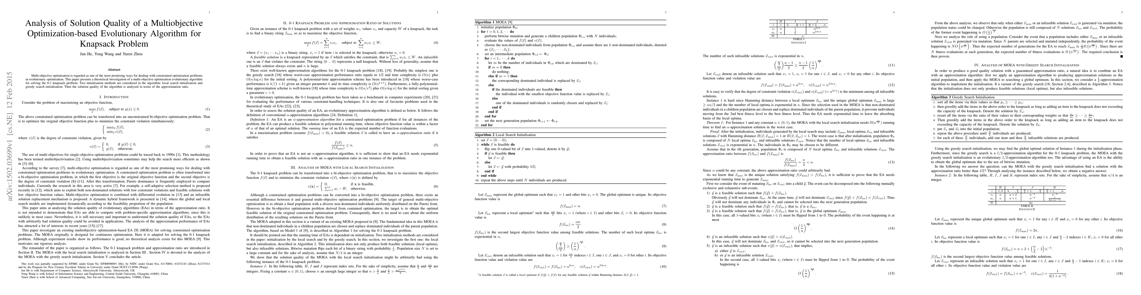 This paper investigates a multi-objective optimisation evolutionary algorithm for solving the 0-1 knapsack problem, comparing two initialisation methods: local search and greedy search. The solution quality is assessed based on the approximation ratio.