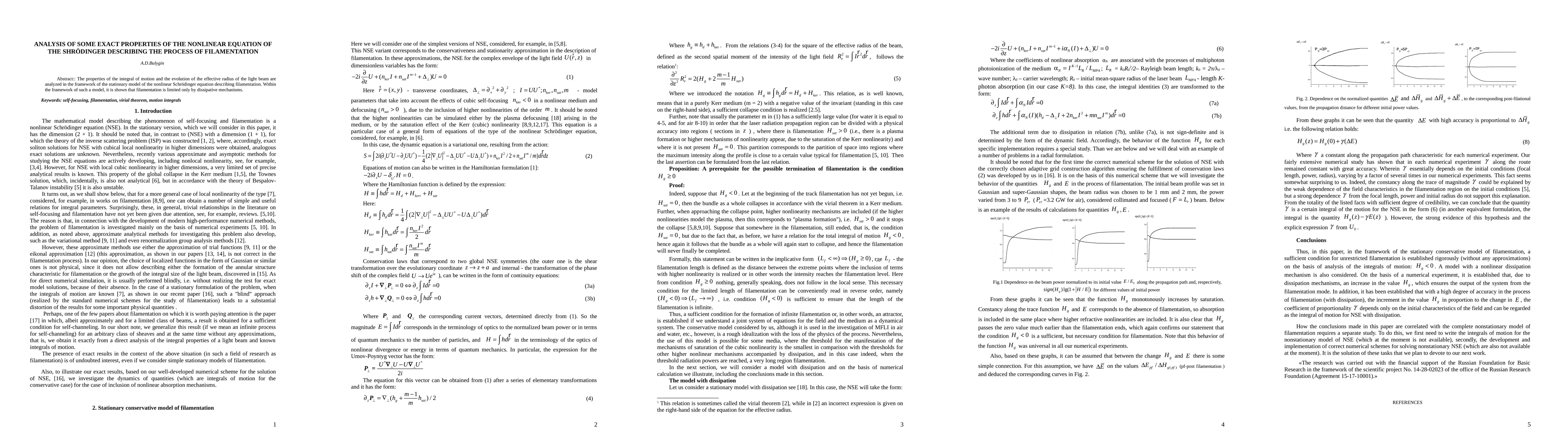 The properties of the integral of motion and the evolution of the effective radius of the light beam are analyzed in the framework of the stationary model of the nonlinear Schrodinger equation describing filamentation. Within the framework of such a model, it is shown that filamentation is limited only by dissipative mechanisms.
