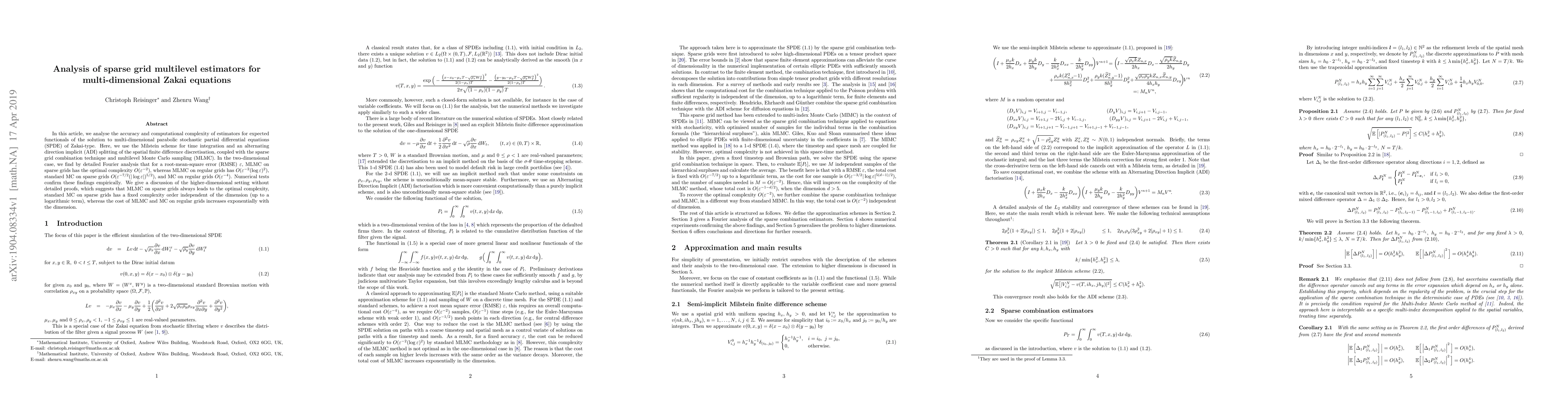 In this article, we analyse the accuracy and computational complexity of estimators for expected functionals of the solution to multi-dimensional parabolic stochastic partial differential equations (SPDE) of Zakai-type. Here, we use the Milstein scheme for time integration and an alternating direction implicit (ADI) splitting of the spatial finite difference discretisation, coupled with the sparse grid combination technique and multilevel Monte Carlo sampling (MLMC). In the two-dimensional case, we find by detailed Fourier analysis that for a root-mean-square error (RMSE) $\varepsilon$, MLMC on sparse grids has the optimal complexity $O(\varepsilon^{-2})$, whereas MLMC on regular grids has $O(\varepsilon^{-2}(\log\varepsilon)^2)$, standard MC on sparse grids $O(\varepsilon^{-7/2}(|\log\varepsilon|)^{5/2})$, and MC on regular grids $O(\varepsilon^{-4})$. Numerical tests confirm these findings empirically. We give a discussion of the higher-dimensional setting without detailed proofs, which suggests that MLMC on sparse grids always leads to the optimal complexity, standard MC on sparse grids has a fixed complexity order independent of the dimension (up to a logarithmic term), whereas the cost of MLMC and MC on regular grids increases exponentially with the dimension.