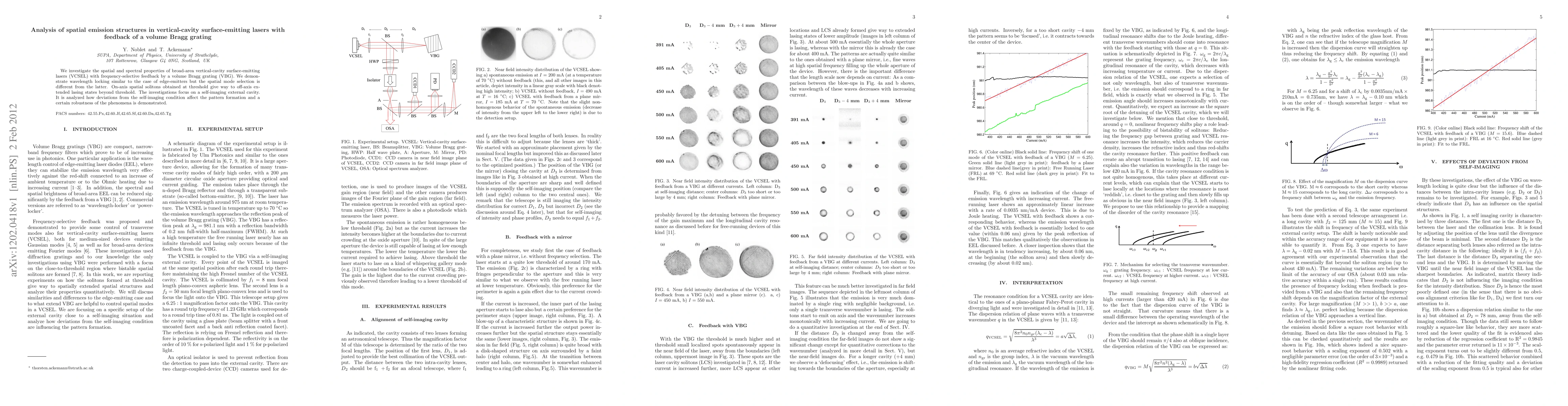 This paper analyzes the spatial and spectral properties of vertical-cavity surface-emitting lasers (VCSEL) with feedback from a volume Bragg grating, showing wavelength locking and different spatial mode selection compared to edge-emitters. It explores the transition from on-axis spatial solitons to off-axis extended lasing states and the robustness of these phenomena under deviations from self-imaging conditions.