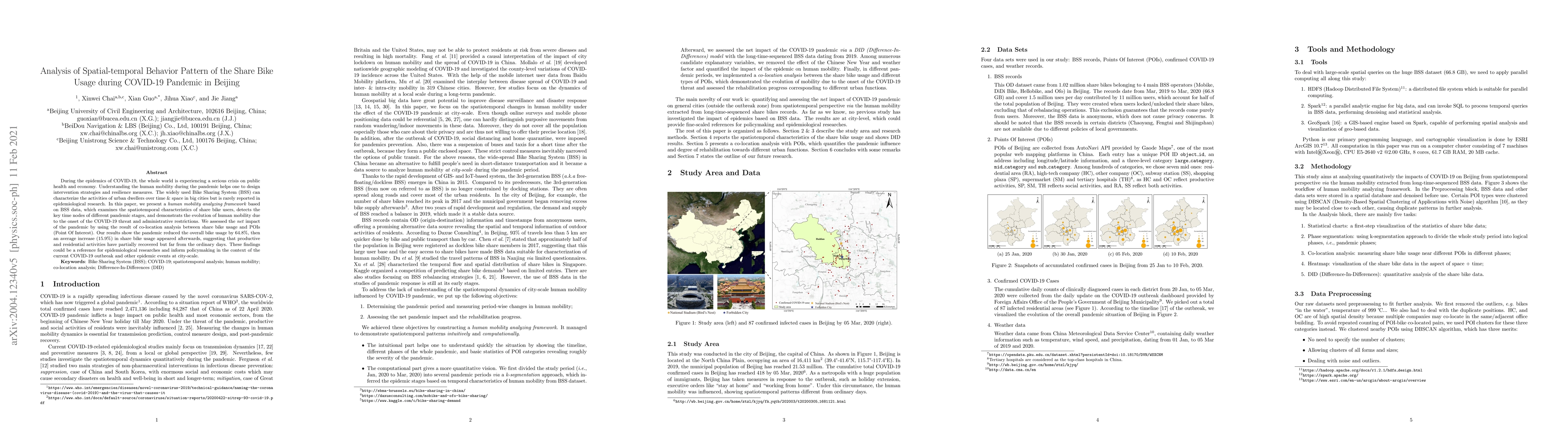 This paper analyzes the spatial-temporal behavior of share bike usage in Beijing during the COVID-19 pandemic, revealing a 64.8% reduction in bike usage initially, followed by a 15.9% increase, indicating partial recovery of activities. The findings suggest the potential for informing policymaking and epidemiological research during future pandemics.