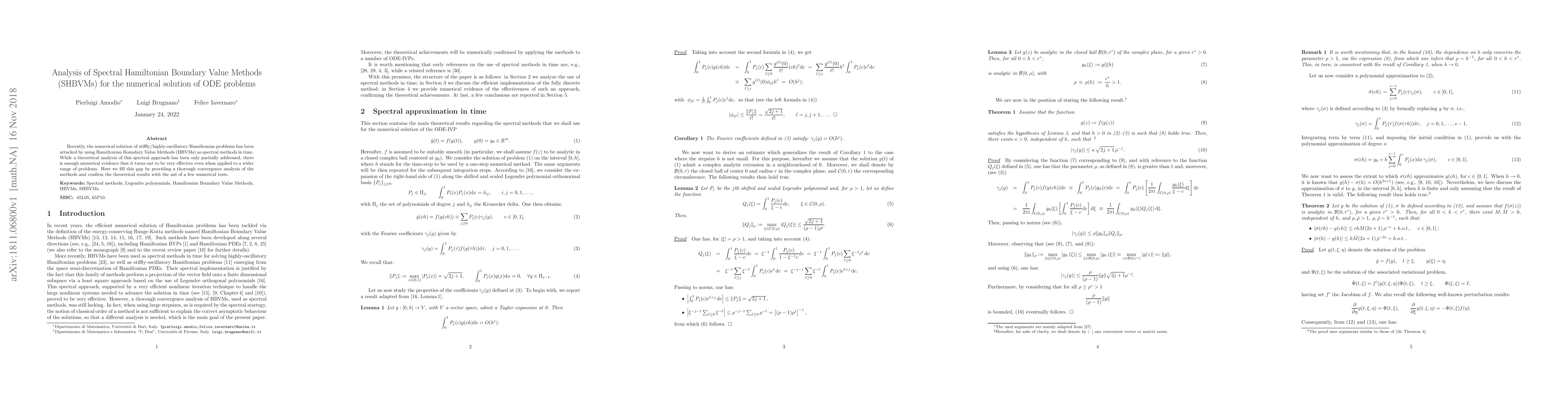 Recently, the numerical solution of stiffly/highly-oscillatory Hamiltonian problems has been attacked by using Hamiltonian Boundary Value Methods (HBVMs) as spectral methods in time. While a theoretical analysis of this spectral approach has been only partially addressed, there is enough numerical evidence that it turns out to be very effective even when applied to a wider range of problems. Here we fill this gap by providing a thorough convergence analysis of the methods and confirm the theoretical results with the aid of a few numerical tests.
