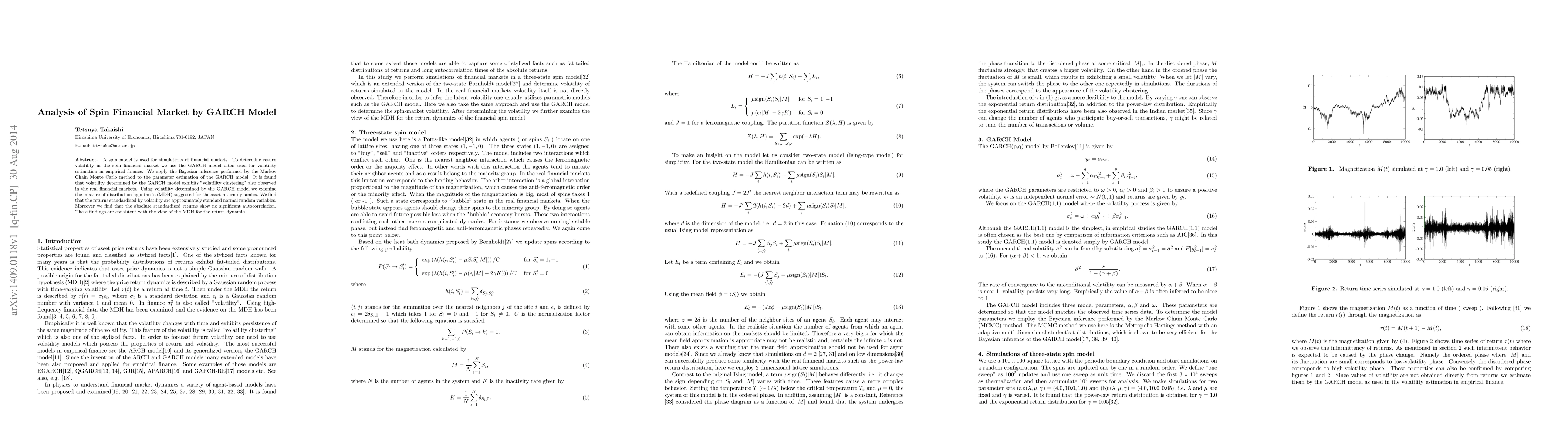 This paper employs a spin model and GARCH model to analyze return volatility in financial markets, finding "volatility clustering" and supporting the mixture-of-distribution hypothesis (MDH) as returns standardized by volatility are approximately standard normal with no significant autocorrelation. Bayesian inference via Markov Chain Monte Carlo is used for parameter estimation.