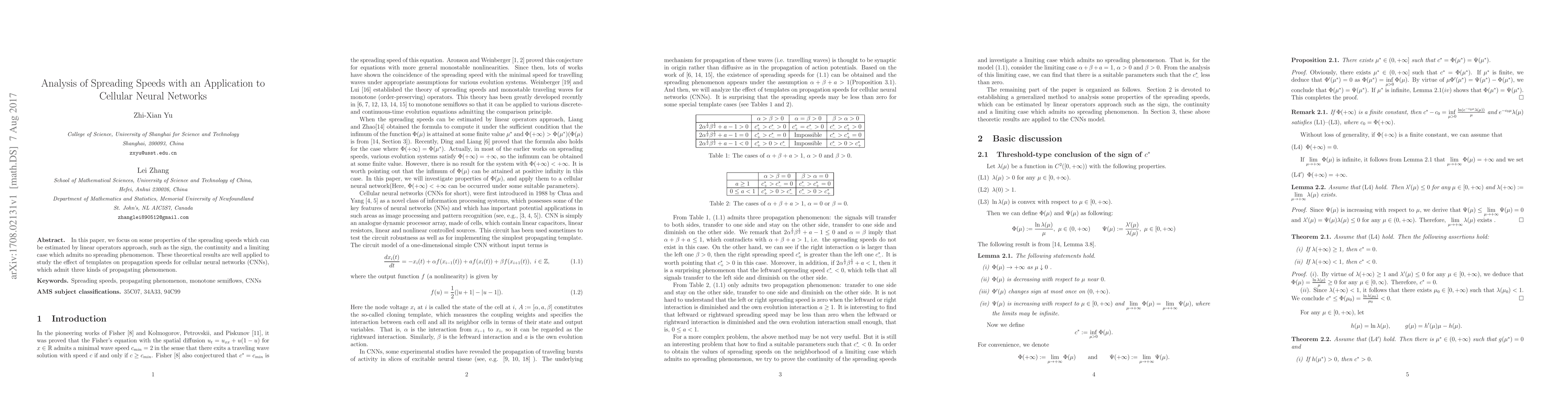 In this paper, we focus on some properties of the spreading speeds which can be estimated by linear operators approach, such as the sign, the continuity and a limiting case which admits no spreading phenomenon. These theoretical results are well applied to study the effect of templates on propagation speeds for cellular neural networks (CNNs), which admit three kinds of propagating phenomenon.
