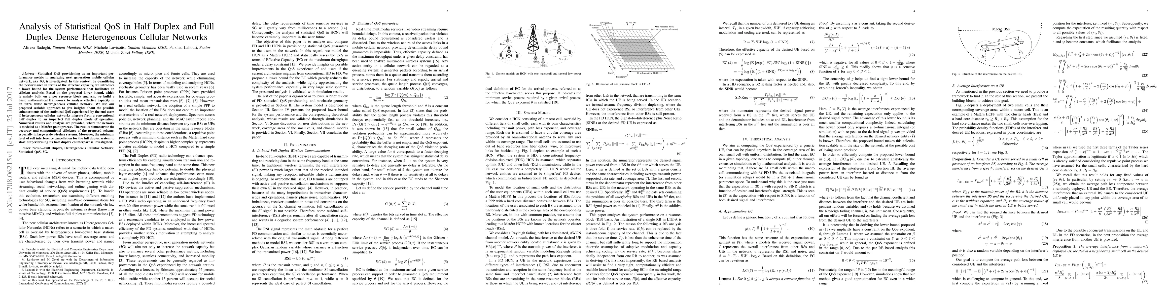 This paper investigates statistical Quality of Service (QoS) in dense heterogeneous cellular networks, proposing a lower bound for effective capacity analysis. It compares half duplex and full duplex operations, demonstrating that full duplex can enhance QoS with sufficient self-interference cancellation, validated through a Matern point process model.