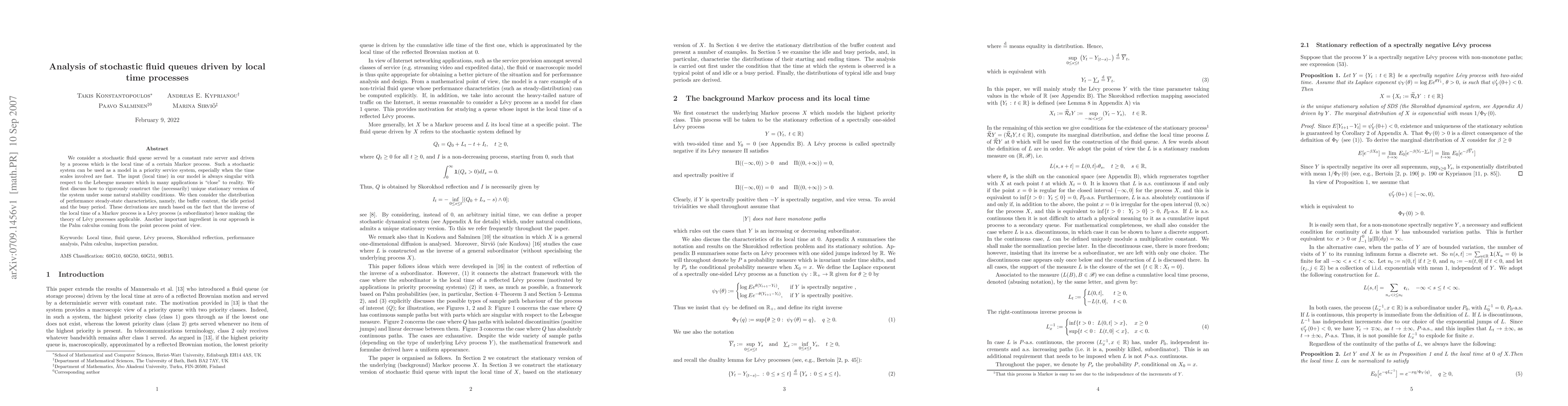 We consider a stochastic fluid queue served by a constant rate server and driven by a process which is the local time of a certain Markov process. Such a stochastic system can be used as a model in a priority service system, especially when the time scales involved are fast. The input (local time) in our model is always singular with respect to the Lebesgue measure which in many applications is ``close'' to reality. We first discuss how to rigorously construct the (necessarily) unique stationary version of the system under some natural stability conditions. We then consider the distribution of performance steady-state characteristics, namely, the buffer content, the idle period and the busy period. These derivations are much based on the fact that the inverse of the local time of a Markov process is a L\'evy process (a subordinator) hence making the theory of L\'evy processes applicable. Another important ingredient in our approach is the Palm calculus coming from the point process point of view.