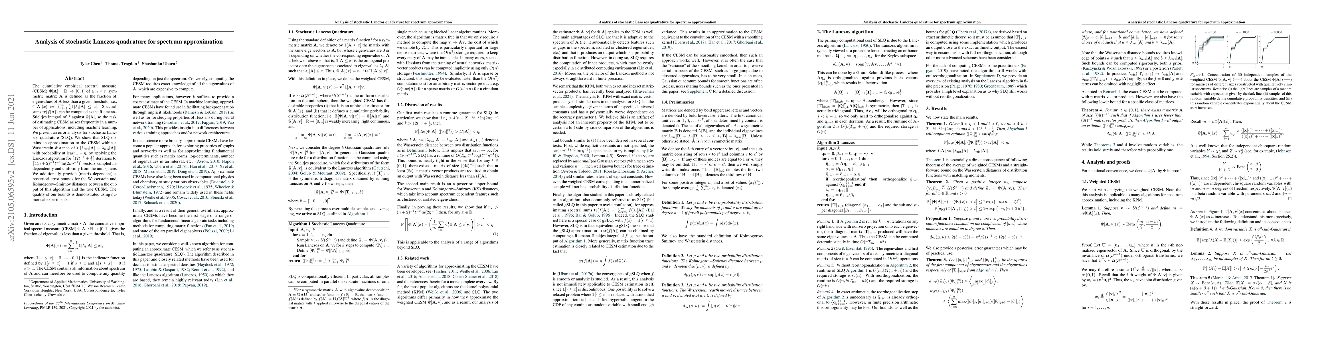 This paper presents an error analysis for stochastic Lanczos quadrature, showing it can approximate a matrix's cumulative empirical spectral measure with high accuracy within a specified distance, using a method that applies the Lanczos algorithm to randomly sampled vectors from a unit sphere.