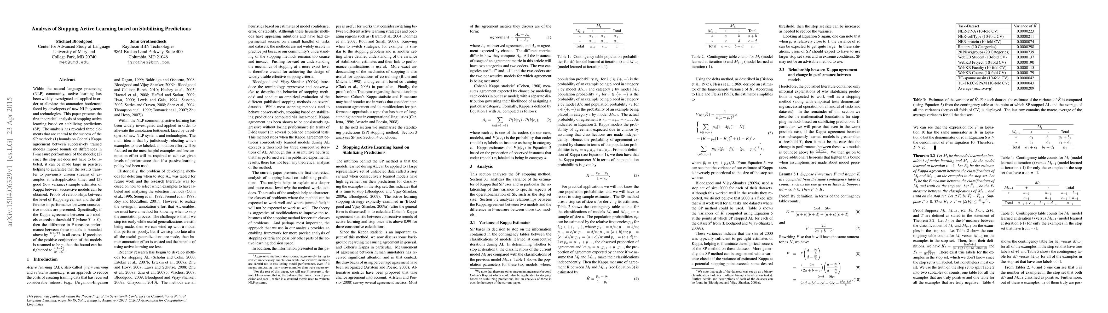 Within the natural language processing (NLP) community, active learning has been widely investigated and applied in order to alleviate the annotation bottleneck faced by developers of new NLP systems and technologies. This paper presents the first theoretical analysis of stopping active learning based on stabilizing predictions (SP). The analysis has revealed three elements that are central to the success of the SP method: (1) bounds on Cohen's Kappa agreement between successively trained models impose bounds on differences in F-measure performance of the models; (2) since the stop set does not have to be labeled, it can be made large in practice, helping to guarantee that the results transfer to previously unseen streams of examples at test/application time; and (3) good (low variance) sample estimates of Kappa between successive models can be obtained. Proofs of relationships between the level of Kappa agreement and the difference in performance between consecutive models are presented. Specifically, if the Kappa agreement between two models exceeds a threshold T (where $T>0$), then the difference in F-measure performance between those models is bounded above by $\frac{4(1-T)}{T}$ in all cases. If precision of the positive conjunction of the models is assumed to be $p$, then the bound can be tightened to $\frac{4(1-T)}{(p+1)T}$.