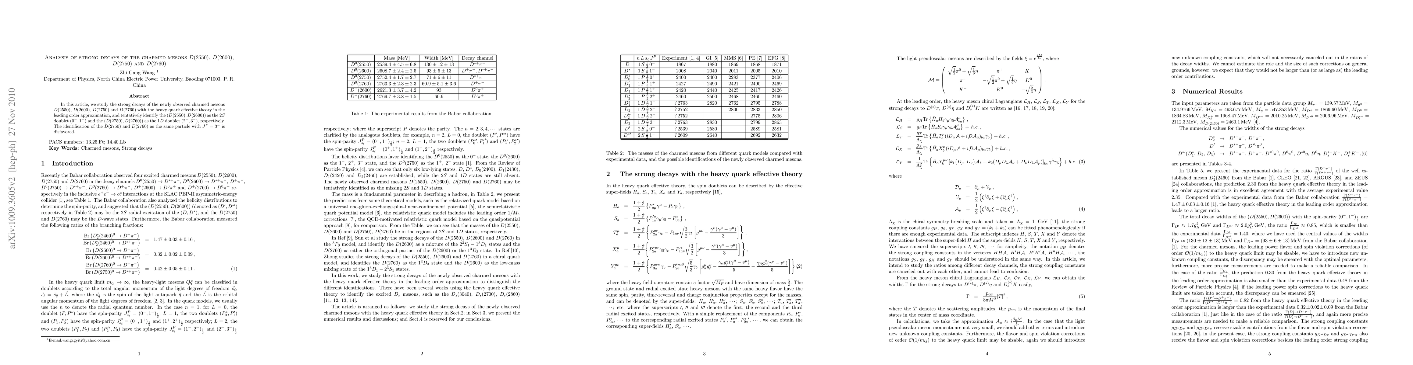 In this article, we study the strong decays of the newly observed charmed mesons $D(2550)$, $D(2600)$, $D(2750)$ and $D(2760)$ with the heavy quark effective theory in the leading order approximation, and tentatively identify the $(D(2550),D(2600))$ as the $2S$ doublet $(0^-,1^-)$ and the $(D(2750),D(2760))$ as the $1D$ doublet $(2^-,3^-)$, respectively. The identification of the $D(2750)$ and $D(2760)$ as the same particle with $J^P=3^-$ is disfavored.