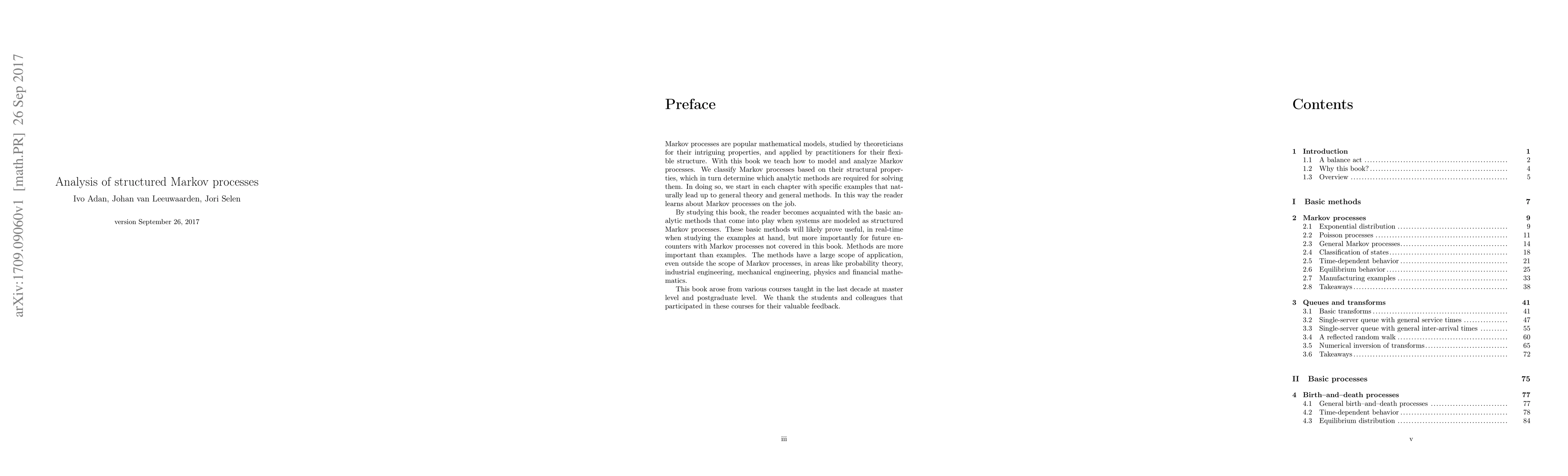 Markov processes are popular mathematical models, studied by theoreticians for their intriguing properties, and applied by practitioners for their flexible structure. With this book we teach how to model and analyze Markov processes. We classify Markov processes based on their structural properties, which in turn determine which analytic methods are required for solving them. In doing so, we start in each chapter with specific examples that naturally lead up to general theory and general methods. In this way the reader learns about Markov processes on the job. By studying this book, the reader becomes acquainted with the basic analytic methods that come into play when systems are modeled as structured Markov processes. These basic methods will likely prove useful, in real-time when studying the examples at hand, but more importantly for future encounters with Markov processes not covered in this book. Methods are more important than examples. The methods have a large scope of application, even outside the scope of Markov processes, in areas like probability theory, industrial engineering, mechanical engineering, physics and financial mathematics.