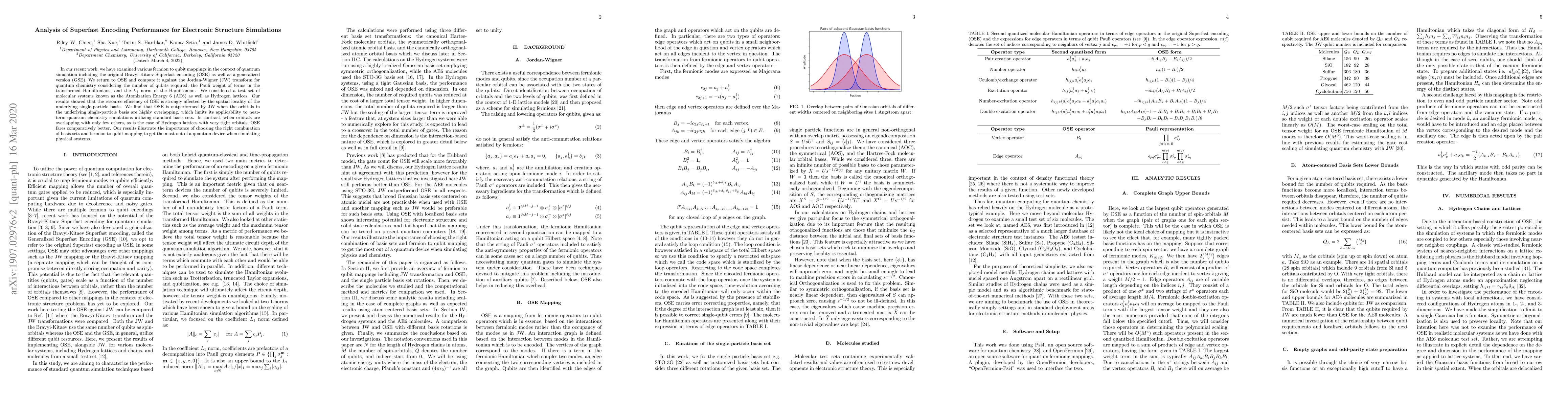 This paper compares the Bravyi-Kitaev Superfast encoding (OSE) and the Jordan-Wigner (JW) transform for quantum chemistry simulations, finding that OSE is less efficient for highly overlapping orbitals but performs better for systems with less overlapping orbitals, like Hydrogen lattices.