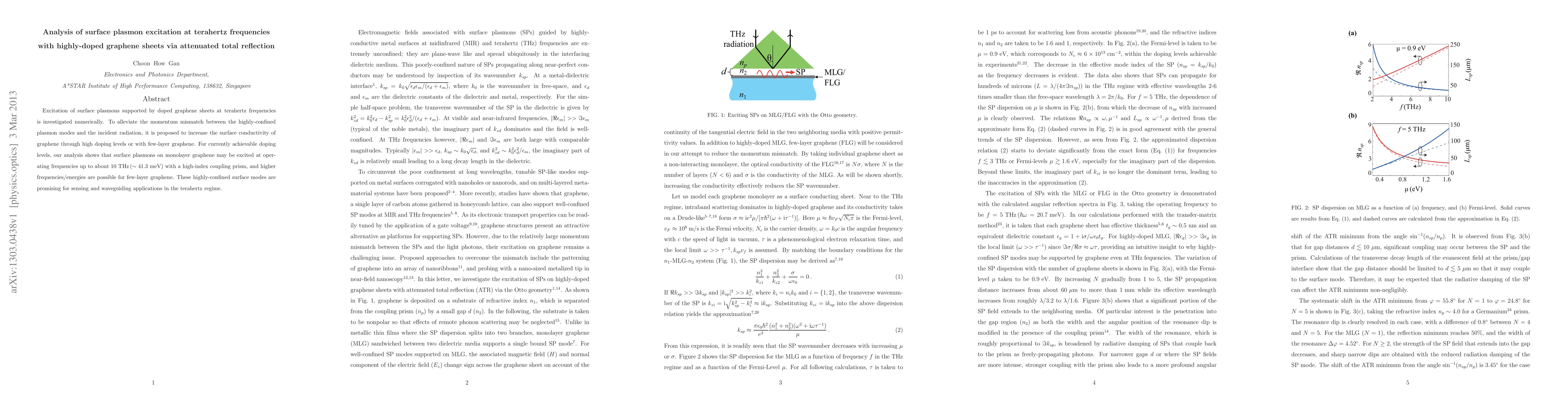 This paper numerically analyzes the excitation of surface plasmons at terahertz frequencies using highly-doped graphene sheets. It finds that monolayer graphene can support plasmon excitation up to 10 THz with a high-index coupling prism, while few-layer graphene can achieve higher frequencies, making these modes useful for terahertz sensing and waveguiding.