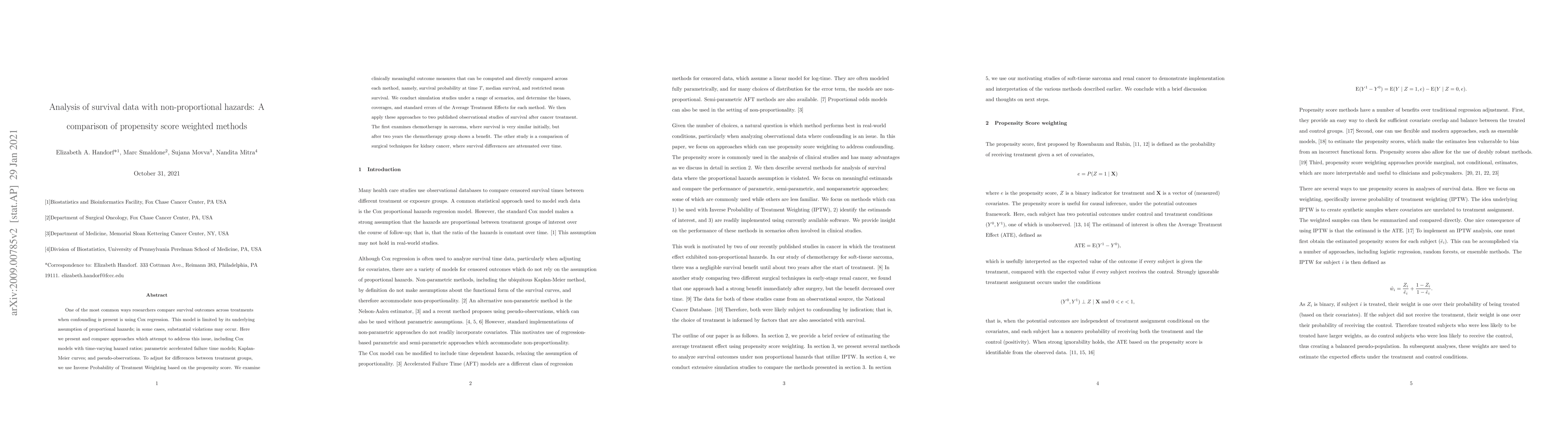 This paper compares various survival analysis methods for non-proportional hazards, including Cox models with time-varying hazard ratios, parametric accelerated failure time models, and others, using Inverse Probability of Treatment Weighting based on propensity scores. It evaluates these methods through simulation studies and real-world applications in cancer treatment studies.