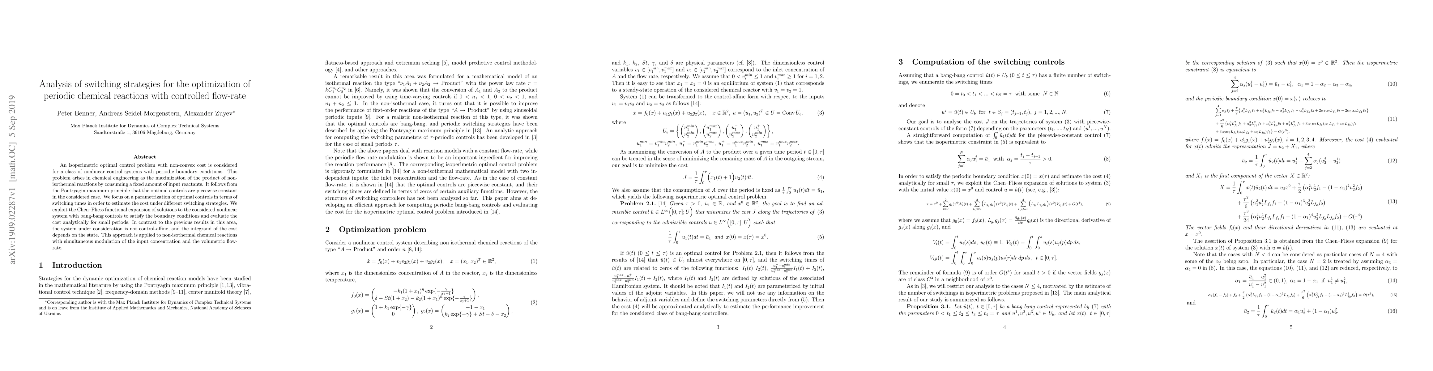 An isoperimetric optimal control problem with non-convex cost is considered for a class of nonlinear control systems with periodic boundary conditions. This problem arises in chemical engineering as the maximization of the product of non-isothermal reactions by consuming a fixed amount of input reactants. It follows from the Pontryagin maximum principle that the optimal controls are piecewise constant in the considered case. We focus on a parametrization of optimal controls in terms of switching times in order to estimate the cost under different switching strategies. We exploit the Chen-Fliess functional expansion of solutions to the considered nonlinear system with bang-bang controls to satisfy the boundary conditions and evaluate the cost analytically for small periods. In contrast to the previous results in this area, the system under consideration is not control-affine, and the integrand of the cost depends on the state. This approach is applied to non-isothermal chemical reactions with simultaneous modulation of the input concentration and the volumetric flow-rate.