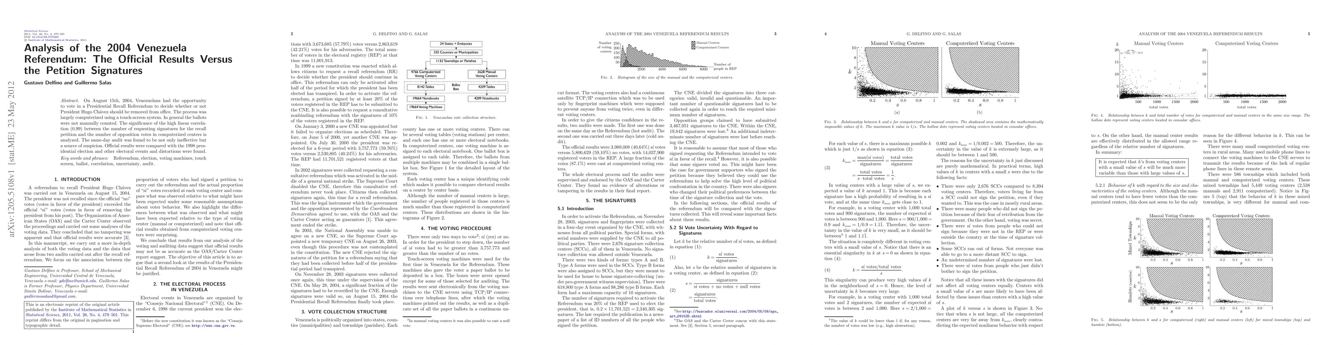 On August 15th, 2004, Venezuelans had the opportunity to vote in a Presidential Recall Referendum to decide whether or not President Hugo Ch\'{a}vez should be removed from office. The process was largely computerized using a touch-screen system. In general the ballots were not manually counted. The significance of the high linear correlation (0.99) between the number of requesting signatures for the recall petition and the number of opposition votes in computerized centers is analyzed. The same-day audit was found to be not only ineffective but a source of suspicion. Official results were compared with the 1998 presidential election and other electoral events and distortions were found.