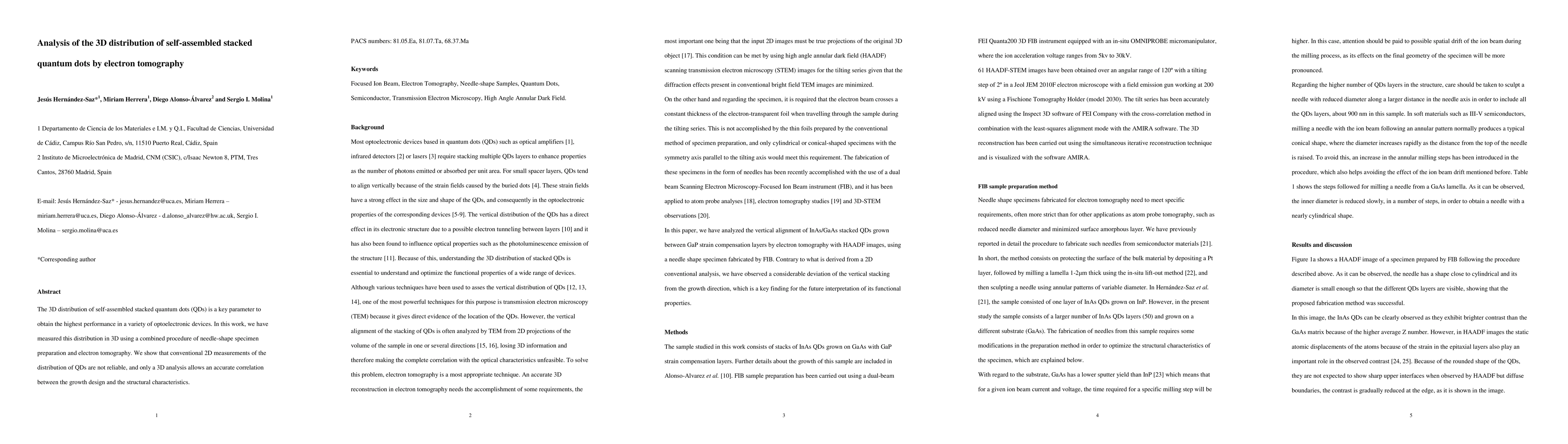 This paper has been withdrawn by the authors. The 3D distribution of self-assembled stacked quantum dots (QDs) is a key parameter to obtain the highest performance in a variety of optoelectronic devices. In this work, we have measured this distribution in 3D using a combined procedure of needle-shape specimen preparation and electron tomography. We show that conventional 2D measurements of the distribution of QDs are not reliable, and only a 3D analysis allows an accurate correlation between the growth design and the structural characteristics.