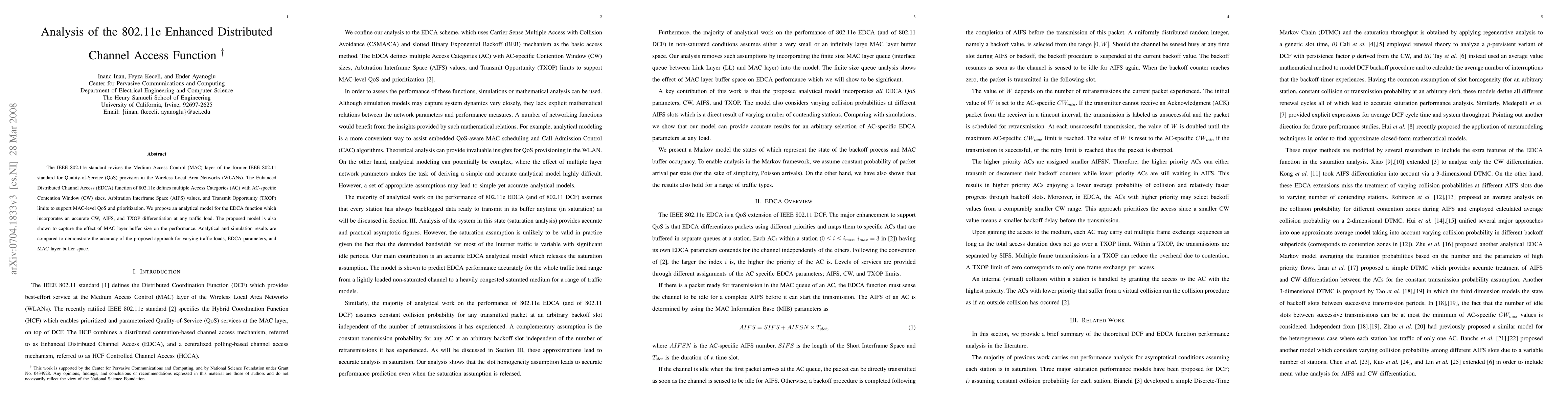 This paper proposes an analytical model for the IEEE 802.11e Enhanced Distributed Channel Access (EDCA) function, which defines multiple Access Categories to support QoS in WLANs. The model accurately differentiates Contention Windows, Arbitration Interframe Spaces, and Transmit Opportunities, and captures the impact of MAC layer buffer size on performance, validated through analytical and simulation comparisons.