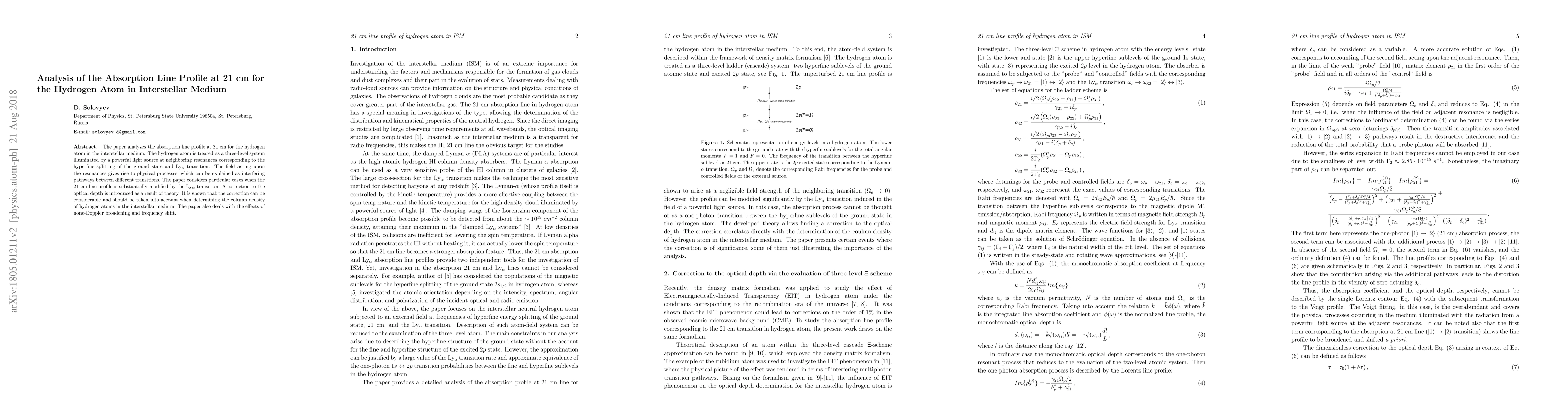 The paper analyzes the absorption line profile at 21 cm for the hydrogen atom in the interstellar medium. The hydrogen atom is treated as a three-level system illuminated by a powerful light source at neighboring resonances corresponding to the hyperfine splitting of the ground state and Ly$_\alpha$ transition. The field acting upon the resonances gives rise to physical processes, which can be explained as interfering pathways between different transitions. The paper considers particular cases when the 21 cm line profile is substantially modified by the Ly$_\alpha$ transition. A correction to the optical depth is introduced as a result of theory. It is shown that the correction can be considerable and should be taken into account when determining the column density of hydrogen atoms in the interstellar medium. The paper also deals with the effects of none-Doppler broadening and frequency shift.