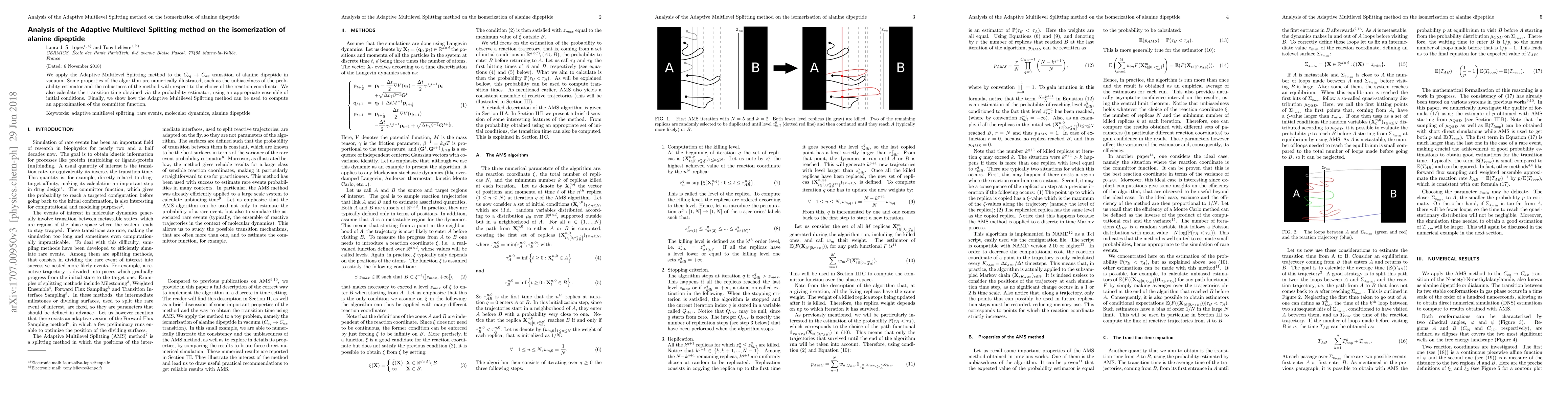 This paper applies the Adaptive Multilevel Splitting method to study the isomerization of alanine dipeptide, demonstrating the algorithm's unbiasedness and robustness. It also calculates the transition time and shows how the method approximates the committor function.