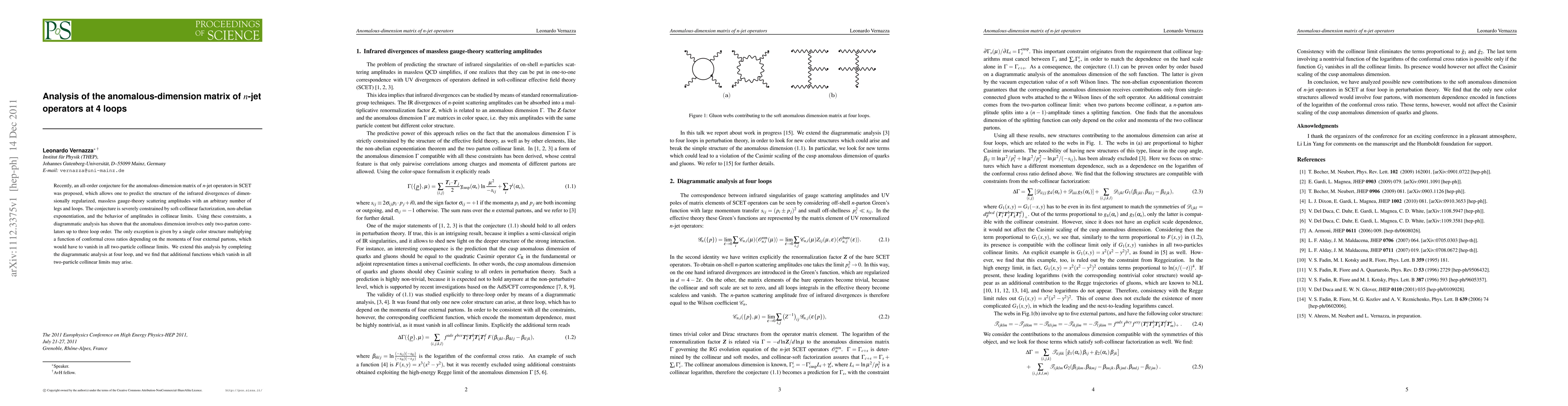 Recently, an all-order conjecture for the anomalous-dimension matrix of n-jet operators in SCET was proposed, which allows one to predict the structure of the infrared divergences of dimensionally regularized, massless gauge-theory scattering amplitudes with an arbitrary number of legs and loops. The conjecture is severely constrained by soft-collinear factorization, non-abelian exponentiation, and the behavior of amplitudes in collinear limits. Using these constraints, a diagrammatic analysis has shown that the anomalous dimension involves only two-parton correlators up to three loop order. The only exception is given by a single color structure multiplying a function of conformal cross ratios depending on the momenta of four external partons, which would have to vanish in all two-particle collinear limits. We extend this analysis by completing the diagrammatic analysis at four loop, and we find that additional functions which vanish in all two-particle collinear limits may arise.