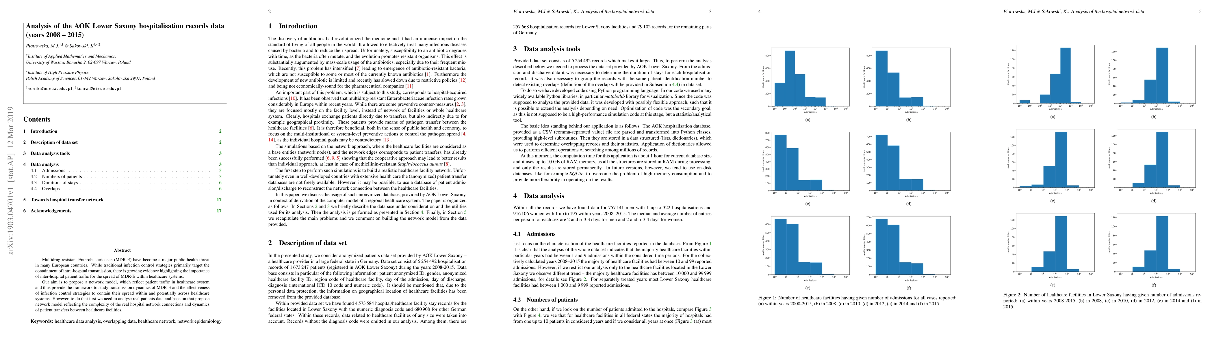 Multidrug-resistant Enterobacteriaceae (MDR-E) have become a major public health threat in many European countries. While traditional infection control strategies primarily target the containment of intra-hospital transmission, there is growing evidence highlighting the importance of inter-hospital patient traffic for the spread of MDR-E within healthcare systems. Our aim is to propose a network model, which will reflect patient traffic in various European healthcare systems and will thus provide the framework to study systematically transmission dynamics of MDR-E and the effectiveness of infection control strategies to contain their spread within and potentially across healthcare systems. However, to do that first we need to analyse real patients data and base on that propose network model reflecting the complexity of the real hospital network connections and dynamics of patient transfers between healthcare facilities.