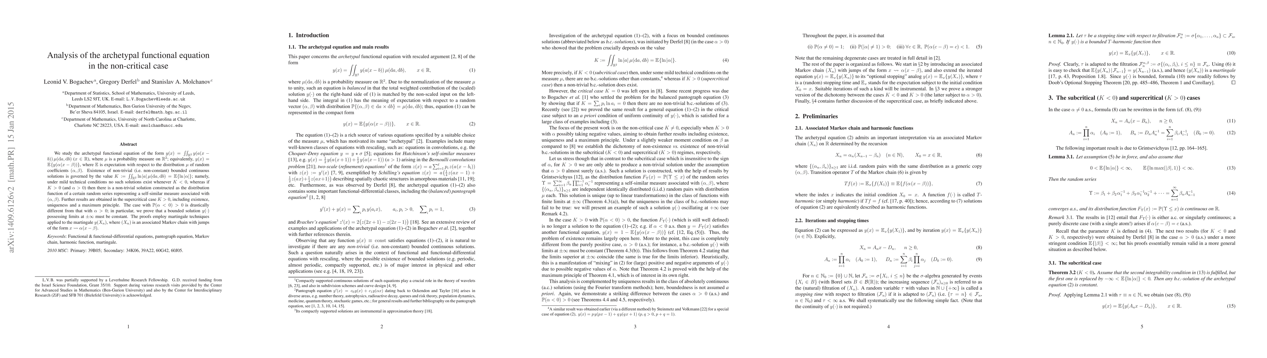 We study the archetypal functional equation of the form $y(x)=\iint_{\mathbb{R}^2} y(a(x-b))\,\mu(\mathrm{d}a,\mathrm{d}b)$ ($x\in\mathbb{R}$), where $\mu$ is a probability measure on $\mathbb{R}^2$; equivalently, $y(x)=\mathbb{E}\{y(\alpha(x-\beta))\}$, where $\mathbb{E}$ is expectation with respect to the distribution $\mu$ of random coefficients $(\alpha,\beta)$. Existence of non-trivial (i.e., non-constant) bounded continuous solutions is governed by the value $K:=\iint_{\mathbb{R}^2}\ln|a|\,\mu(\mathrm{d}a,\mathrm{d}b)=\mathbb{E}\{\ln|\alpha|\}$; namely, under mild technical conditions no such solutions exist whenever $K<0$, whereas if $K>0$ (and $\alpha>0$) then there is a non-trivial solution constructed as the distribution function of a certain random series representing a self-similar measure associated with $(\alpha,\beta)$. Further results are obtained in the supercritical case $K>0$, including existence, uniqueness and a maximum principle. The case with $\mathbb{P}(\alpha<0)>0$ is drastically different from that with $\alpha>0$; in particular, we prove that a bounded solution $y(\cdot)$ possessing limits at $\pm\infty$ must be constant. The proofs employ martingale techniques applied to the martingale $y(X_n)$, where $(X_n)$ is an associated Markov chain with jumps of the form $x\rightsquigarrow\alpha(x-\beta)$.
