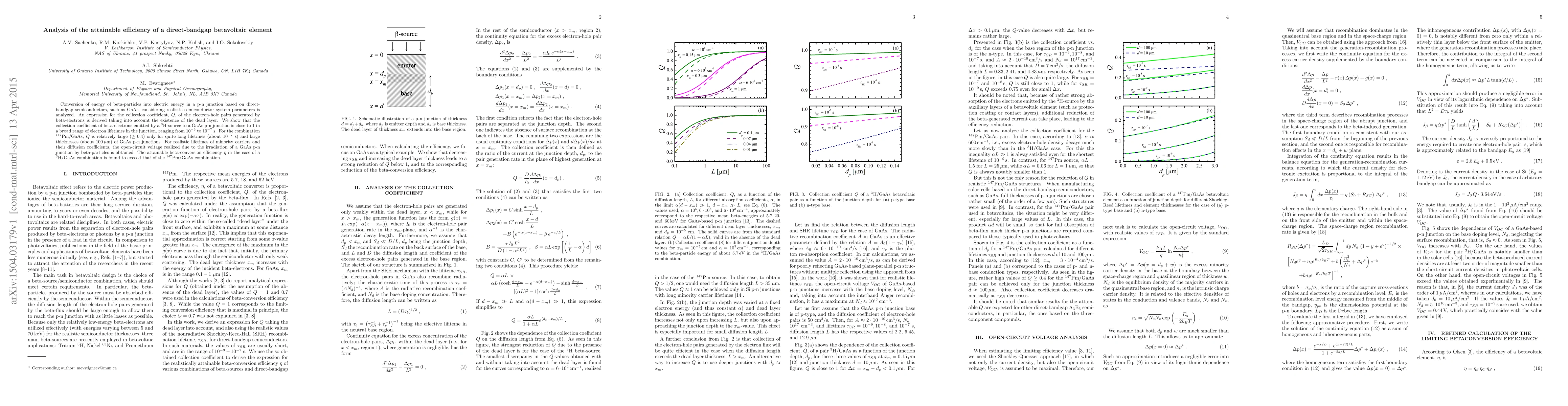 This research analyzes the efficiency of converting beta-particle energy into electric energy using direct-bandgap semiconductors like GaAs. It derives an expression for the collection coefficient of electron-hole pairs generated by beta-electrons, considering a dead layer. The study finds that the collection coefficient for Tr-source to GaAs p-n junction is nearly 1 for electron lifetimes from 10^-9 to 10^-7 s. The open-circuit voltage for realistic lifetimes and diffusion coefficients is obtained, revealing that Tr/GaAs combination yields a higher beta-conversion efficiency than Pm/GaAs combination.