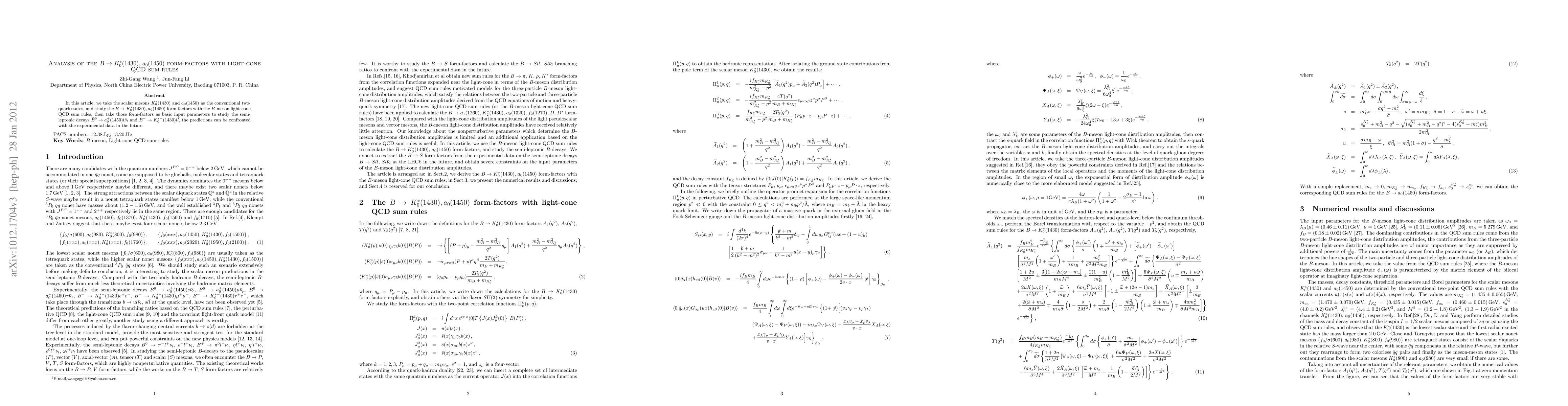 This paper analyzes the $B \to K^*_0(1430), a_0(1450)$ form-factors using light-cone QCD sum rules, and uses these form-factors to study semi-leptonic decay processes $\bar{B}^0\to a_0^+(1450)l \bar{\nu}_l$ and $B^-\to K_0^{*-}(1430)l\bar{l}$. Predictions are made for comparison with future experimental data.