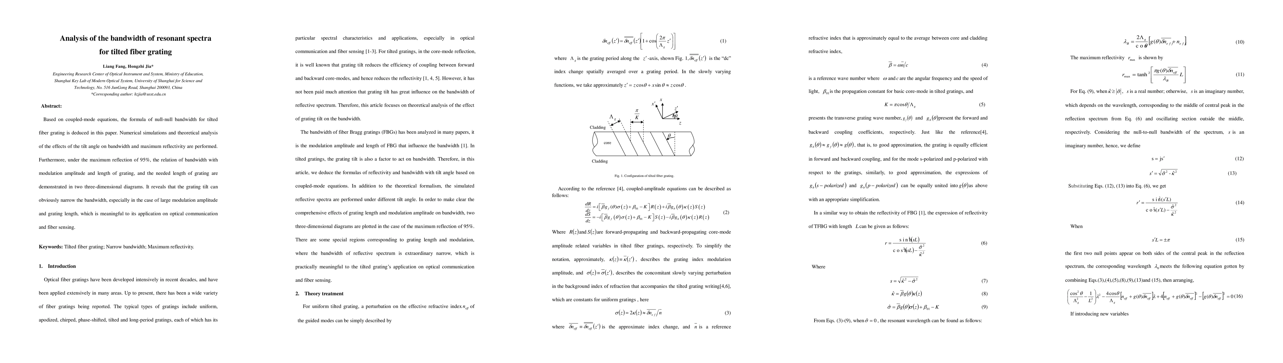This paper deduces the null null bandwidth formula for tilted fiber gratings using coupled mode equations and analyzes the impact of tilt angle on bandwidth and maximum reflectivity. The study shows that grating tilt significantly narrows bandwidth, especially with large modulation amplitude and grating length, which is beneficial for optical communication and fiber sensing applications.