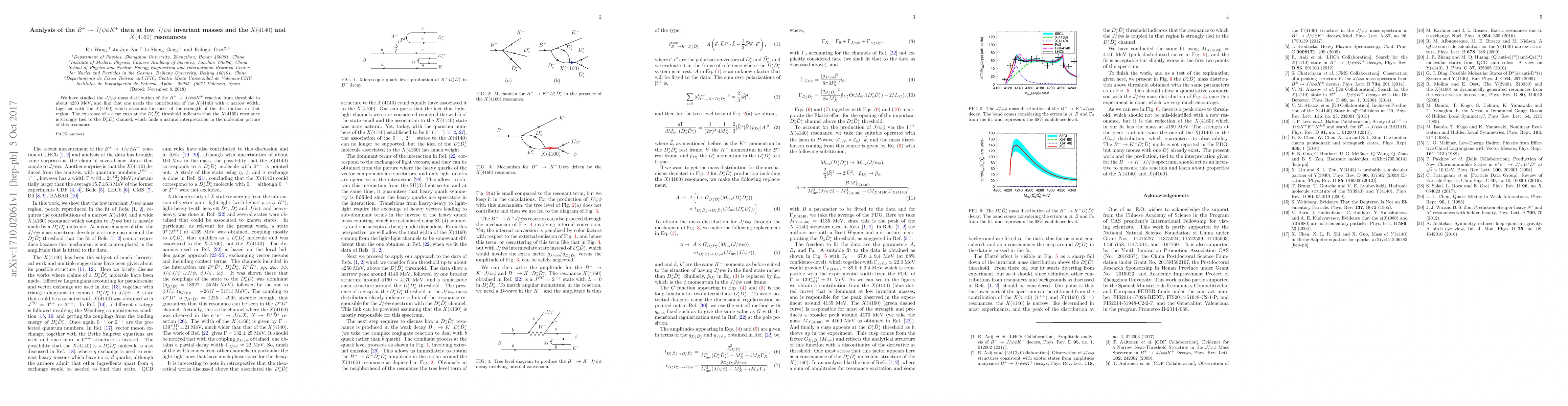 We have studied the $J/\psi \phi$ mass distribution of the $B^+\to J/\psi\phi K^+$ reaction from threshold to about 4250 MeV, and find that one needs the contribution of the $X(4140)$ with a narrow width, together with the $X(4160)$ which accounts for most of the strength of the distribution in that region. The existence of a clear cusp at the $D_s^* \bar{D}_s^*$ threshold indicates that the $X(4160)$ resonance is strongly tied to the $D_s^* \bar{D}_s^*$ channel, which finds a natural interpretation in the molecular picture of this resonance.