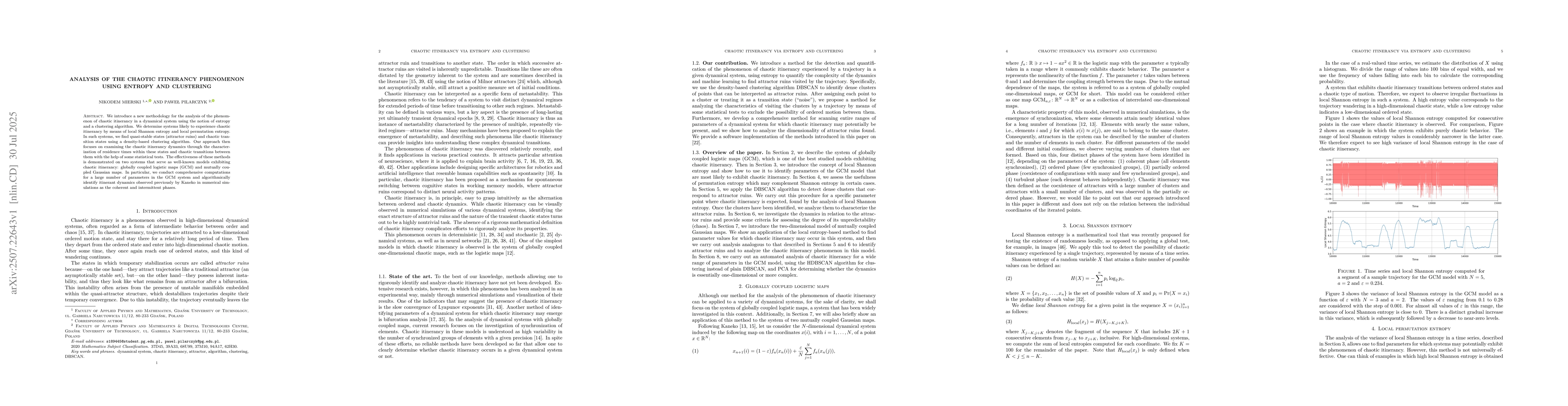 The paper presents a novel combination of entropy measures and density-based clustering for the analysis of chaotic itinerancy, providing a fully algorithmic procedure without manual visual inspection.