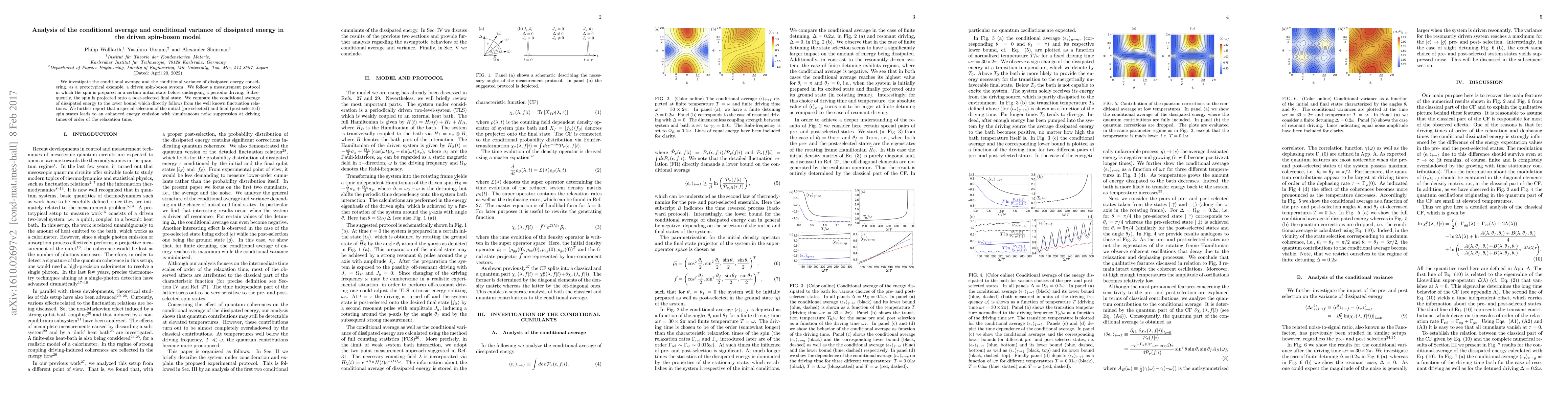 This paper analyzes the conditional average and variance of dissipated energy in a driven spin-boson model, revealing that specific initial and final spin states can enhance energy emission while suppressing noise, aligning with fluctuation relations. The study employs a measurement protocol with periodic driving and post-selection of final states.