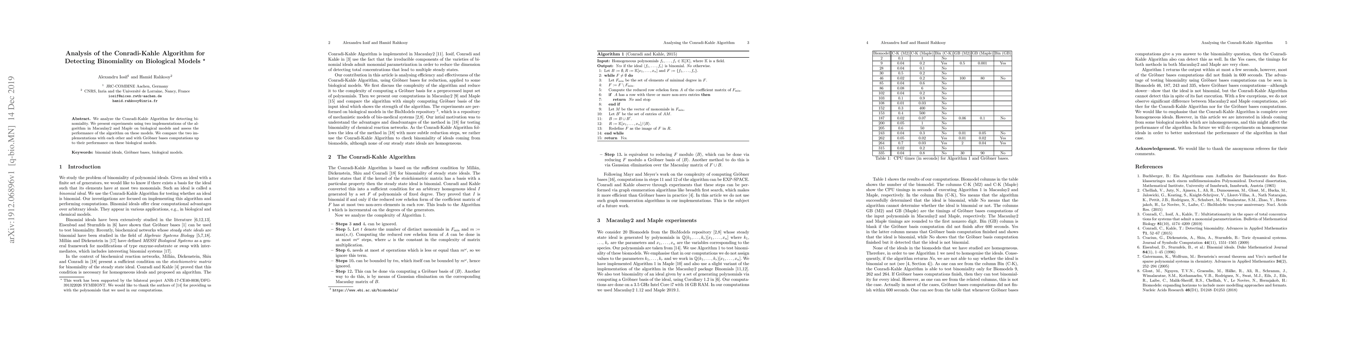 We analyze the Conradi-Kahle Algorithm for detecting binomiality. We present experiments using two implementations of the algorithm in Macaulay2 and Maple on biological models and assess the performance of the algorithm on these models. We compare the two implementations with each other and with Gr\"obner bases computations up to their performance on these biological models.
