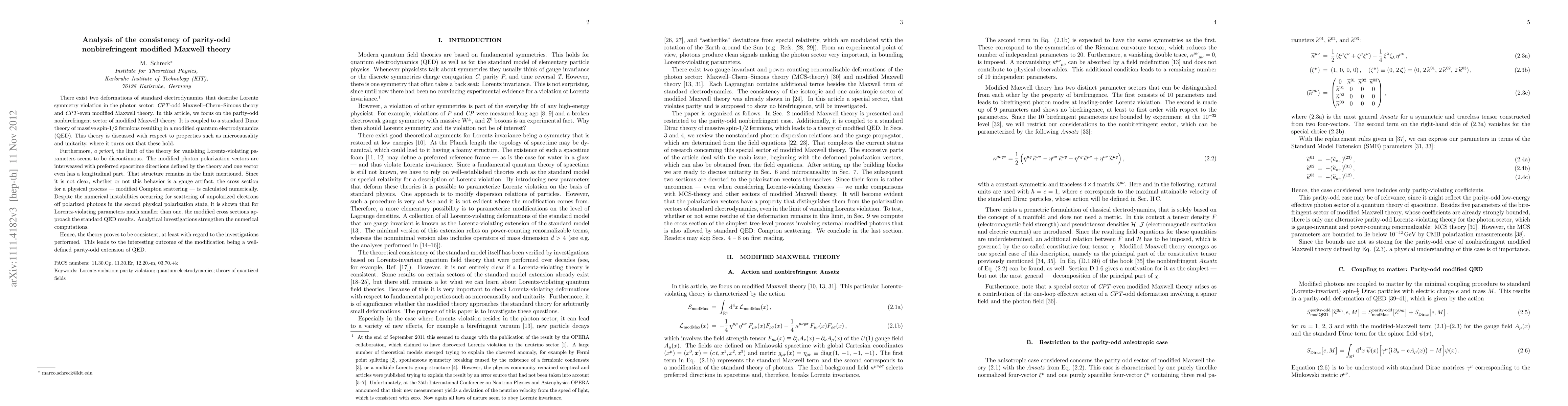 This paper investigates the consistency of a parity-odd nonbirefringent modified Maxwell theory coupled with a standard Dirac theory, demonstrating microcausality and unitarity. The study finds that the theory approaches standard QED for small Lorentz-violating parameters, confirming its consistency despite numerical instabilities in certain physical processes.
