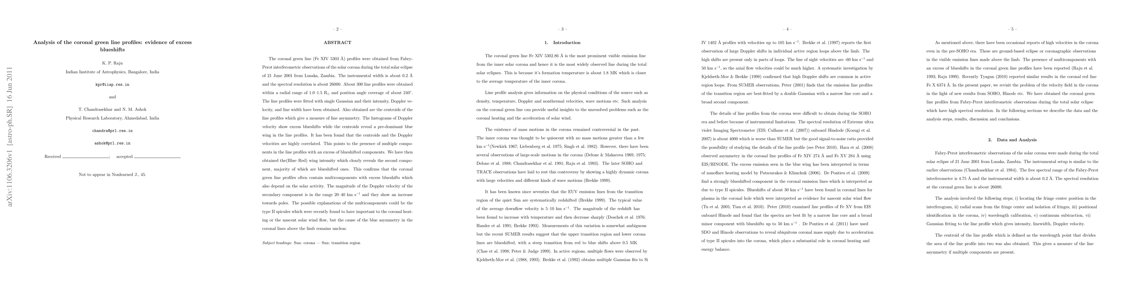This study analyzes coronal green line profiles from solar eclipse observations, revealing excess blueshifts and multiple components in the Fe XIV 5303 Å line. The findings suggest that these blueshifted components may relate to type II spicules or nascent solar wind, though the exact cause of the blue asymmetry remains uncertain.