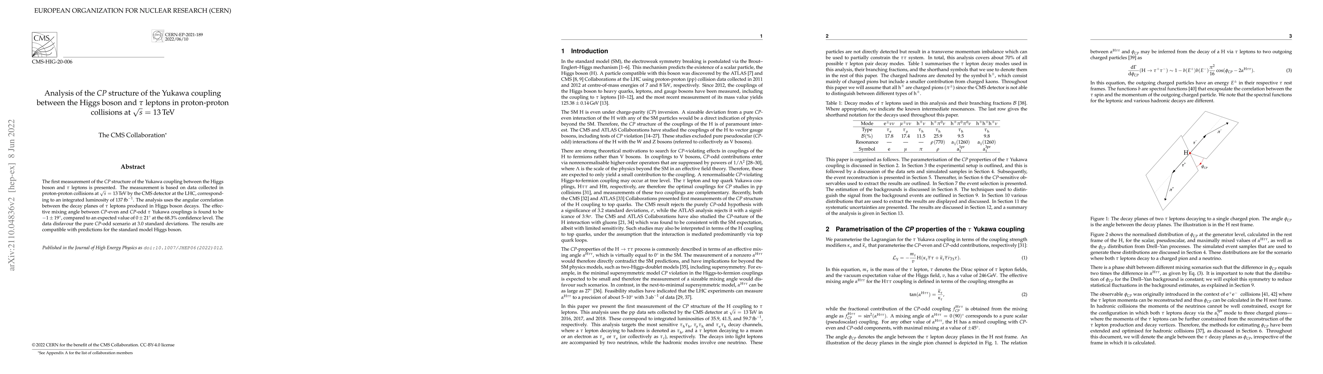 This paper reports the first measurement of the CP structure of the Yukawa coupling between the Higgs boson and $\tau$ leptons, finding an effective mixing angle of $-1 \pm 19^\circ$ and disfavoring a pure CP-odd scenario at 3.0 standard deviations, consistent with standard model predictions.