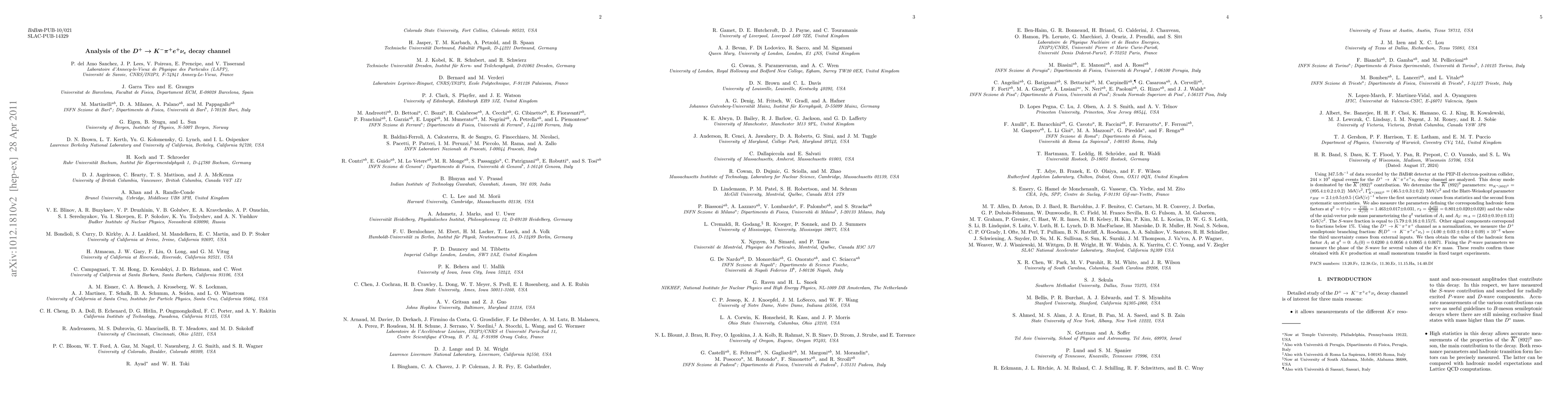 Using 347.5 fb-1 of data recorded by the BABAR detector at the PEP-II electron-positron collider, 244*10^3 signal events for the D+ --> K- pi+ e+ nu_e decay channel are analyzed. This decay mode is dominated by the \bar{K}^*(892)^0 contribution. We determine the \bar{K}^*(892)^0 parameters: m_{K^*(892)^0}=(895.4 +- 0.2 +- 0.2) MeV/c^{2}, \Gamma^0_{K^*(892)^0}=(46.5 +- 0.3 +- 0.2) MeV/c^{2} and the Blatt-Weisskopf parameter $r_{BW}=2.1 +- 0.5 +- 0.5 (GeV/c)^{-1} where the first uncertainty comes from statistics and the second from systematic uncertainties. We also measure the parameters defining the corresponding hadronic form factors at q^{2}=0 (r_{V} = V(0) / A_{1}(0)=1.463 +- 0.017 +- 0.031, r_{2} = A_{2}(0) / A_{1}(0) = 0.801 +- 0.020 +- 0.020) and the value of the axial-vector pole mass parameterizing the q^2 variation of A_{1} and A_{2}: m_{A}=(2.63 +- 0.10 +- 0.13) GeV/c^{2}. The S-wave fraction is equal to (5.79 +- 0.16 +- 0.15)%. Other signal components correspond to fractions below 1%. Using the D+ --> K- pi+ pi+ channel as a normalization, we measure the D+ semileptonic branching fraction: BR(D+ --> K- pi+ e+ nu_e) = (4.04 +- 0.03 +- 0.04 +- 0.09) \times 10^{-2} where the third uncertainty comes from external inputs. We then obtain the value of the hadronic form factor A_1 at q^{2}=0: A_{1}(0) = 0.6226 +- 0.0056 +- 0.0065 +- 0.0074. Fixing the P-wave parameters we measure the phase of the S-wave for several values of the Kpi mass. These results confirm those obtained with Kpi production at small momentum transfer in fixed target experiments.