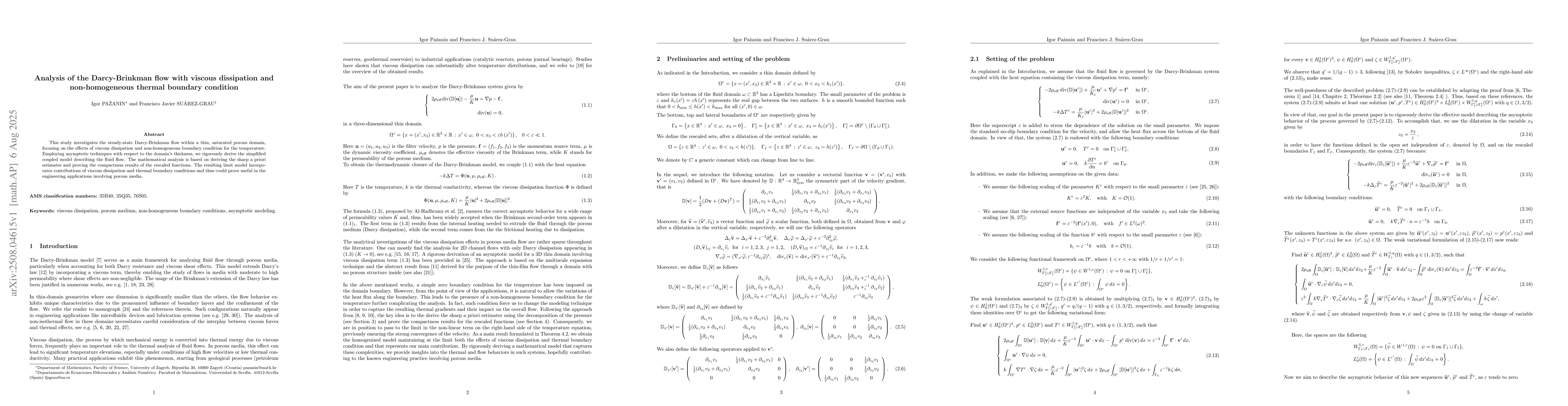This study investigates the steady-state Darcy-Brinkman flow within a thin, saturated porous domain, focusing on the effects of viscous dissipation and non-homogeneous boundary condition for the temperature. Employing asymptotic techniques with respect to the domain's thickness, we rigorously derive the simplified coupled model describing the fluid flow. The mathematical analysis is based on deriving the sharp a priori estimates and proving the compactness results of the rescaled functions. The resulting limit model incorporates contributions of viscous dissipation and thermal boundary conditions and thus could prove useful in the engineering applications involving porous media.