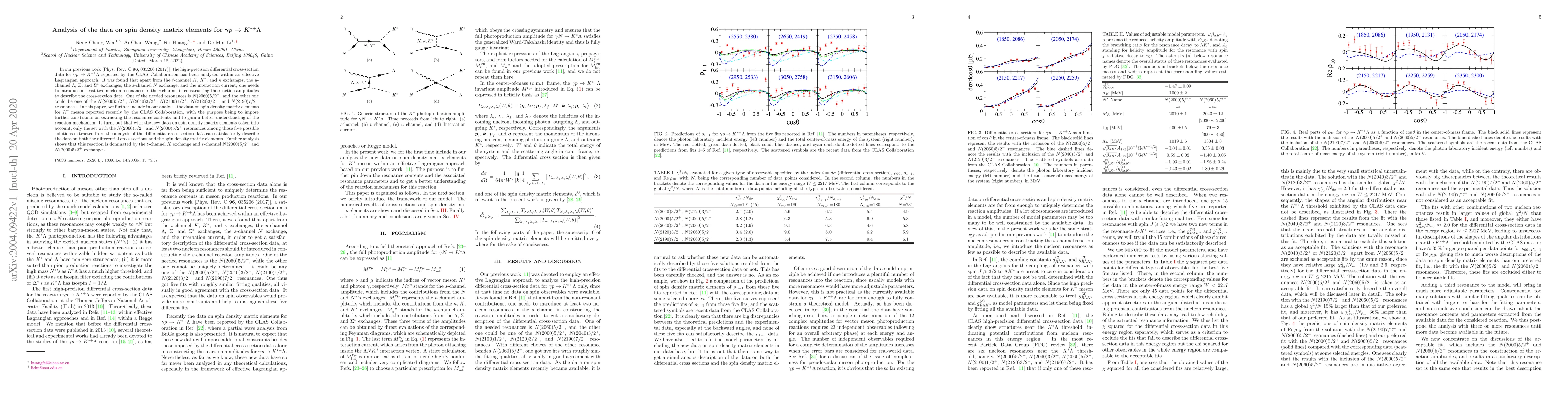 In our previous work [Phys. Rev. C {\bf 96}, 035206 (2017)], the high-precision differential cross-section data for $\gamma p \to K^{*+}\Lambda$ reported by the CLAS Collaboration has been analyzed within an effective Lagrangian approach. It was found that apart from the $t$-channel $K$, $K^*$, and $\kappa$ exchanges, the $u$-channel $\Lambda$, $\Sigma$, and $\Sigma^*$ exchanges, the $s$-channel $N$ exchange, and the interaction current, one needs to introduce at least two nucleon resonances in the $s$ channel in constructing the reaction amplitudes to describe the cross-section data. One of the needed resonances is $N(2060)5/2^-$, and the other one could be one of the $N(2000)5/2^+$, $N(2040)3/2^+$, $N(2100)1/2^+$, $N(2120)3/2^-$, and $N(2190)7/2^-$ resonances. In this paper, we further include in our analysis the data on spin density matrix elements for $K^*$ meson reported recently by the CLAS Collaboration, with the purpose being to impose further constraints on extracting the resonance contents and to gain a better understanding of the reaction mechanism. It turns out that with the new data on spin density matrix elements taken into account, only the set with the $N(2060)5/2^-$ and $N(2000)5/2^+$ resonances among those five possible solutions extracted from the analysis of the differential cross-section data can satisfactorily describe the data on both the differential cross sections and the spin density matrix elements. Further analysis shows that this reaction is dominated by the $t$-channel $K$ exchange and $s$-channel $N(2060)5/2^-$ and $N(2000)5/2^+$ exchanges.