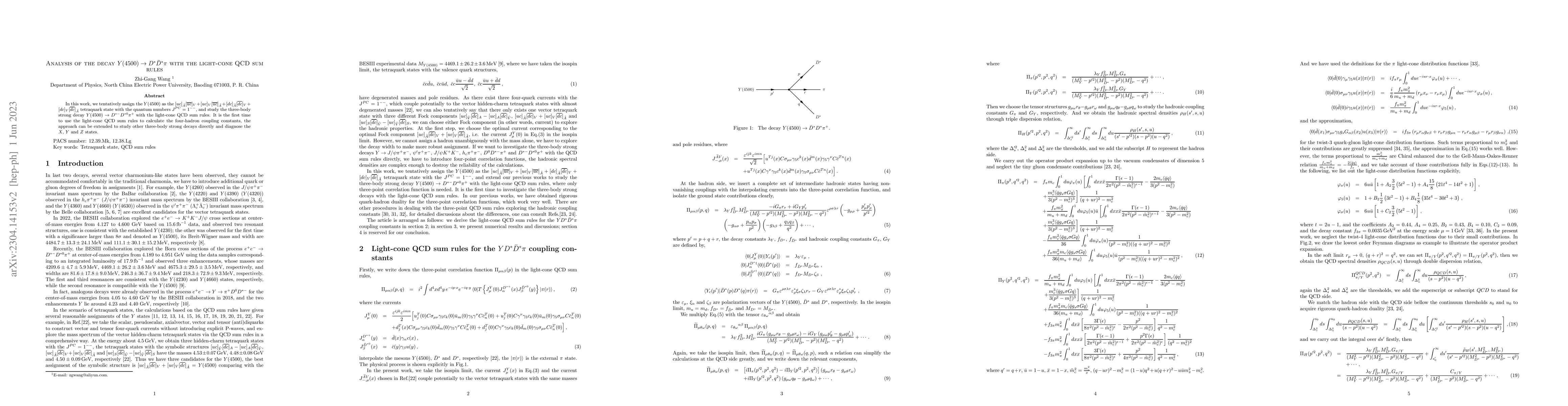 This paper assigns the $Y(4500)$ particle to a tetraquark state with $J^{PC}=1^{--}$ and analyzes its decay into $D^{*-}D^{*0}\pi^+$ using light-cone QCD sum rules, marking the first use of this method to calculate four-hadron coupling constants. The approach can be applied to study other three-body decays and identify exotic states.