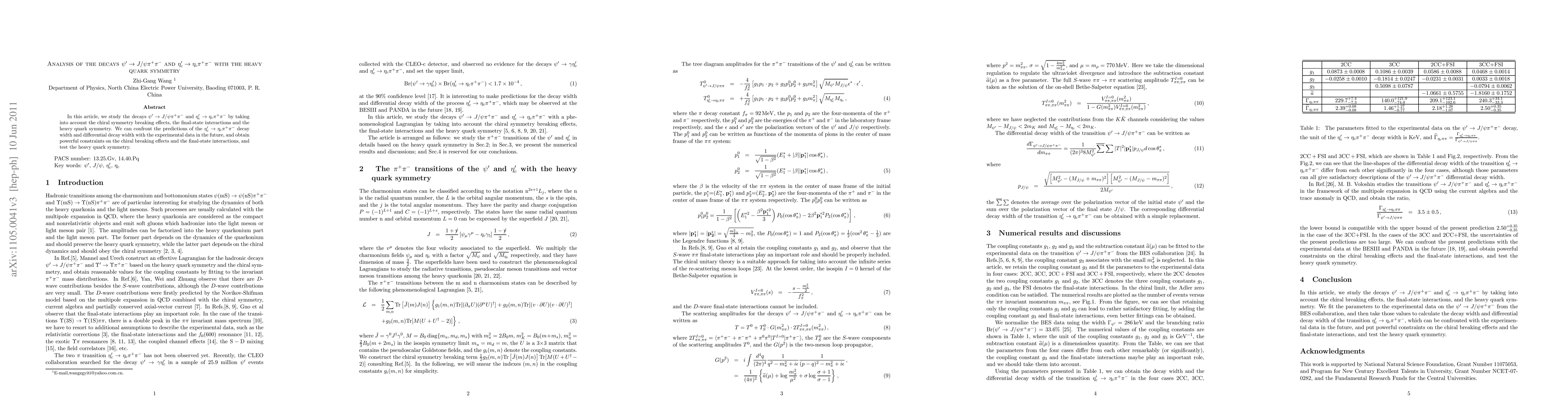This paper analyzes the decays $\psi^{\prime}\to {J/\psi}\pi^+\pi^-$ and $\eta_c^{\prime}\to {\eta_c}\pi^+\pi^-$ using heavy quark symmetry and considers chiral symmetry breaking and final-state interactions. Future experimental data can be used to test these predictions and provide insights into chiral symmetry breaking and final-state interactions.
